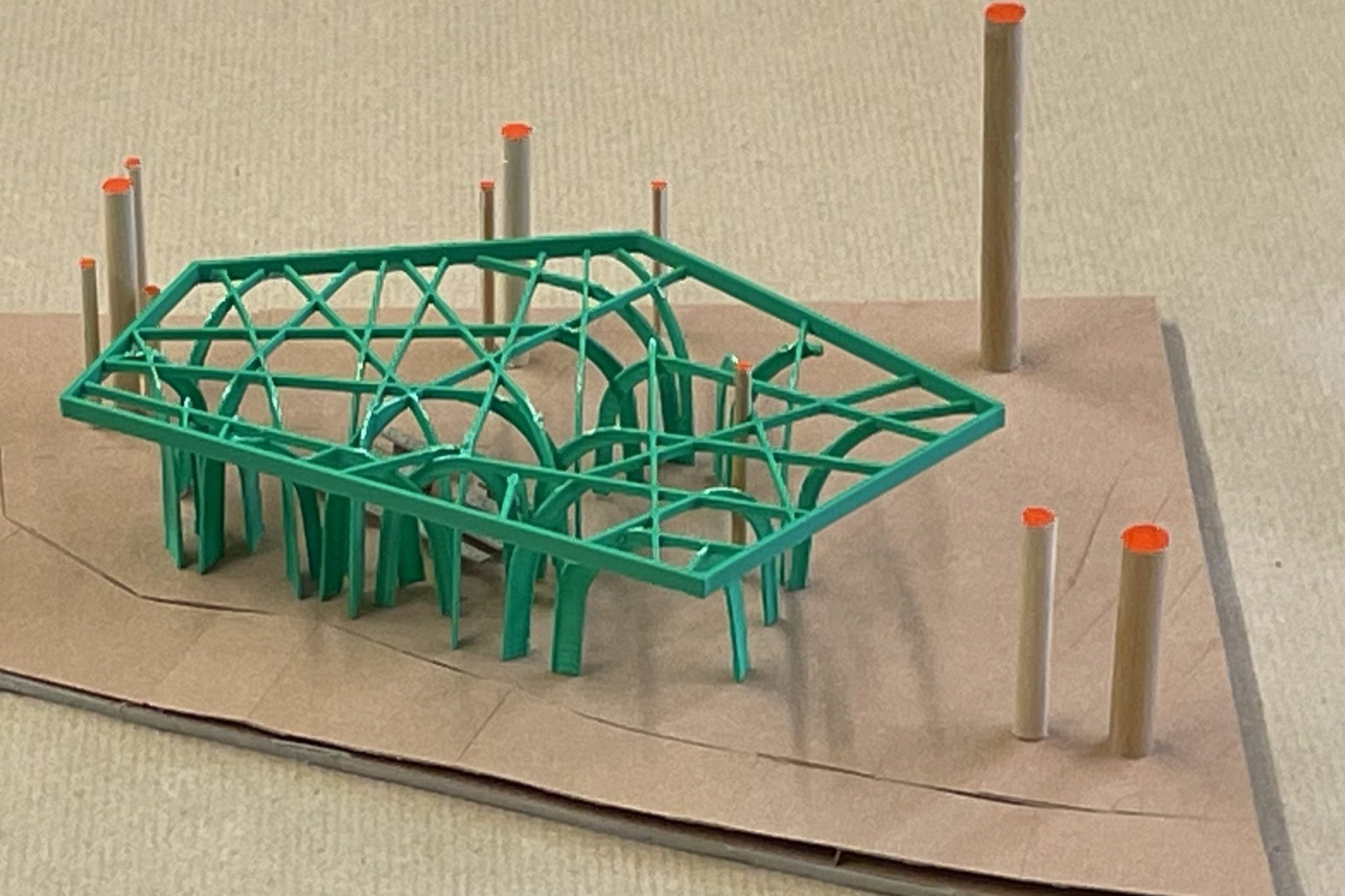 The project tasked students with designing a pavilion or roof structure for a “Friedwald” (forest cemetery) using regionally sourced wood. The pavilion is intended as a space for funeral ceremonies, providing shelter for approximately 35 seated attendees and an officiating priest or speaker. The design brief emphasized on Material Responsiveness, Generative Design and Hybrid Material Approaches incorporating hybrid materials with wood to achieve specific structural and aesthetic outcomes.