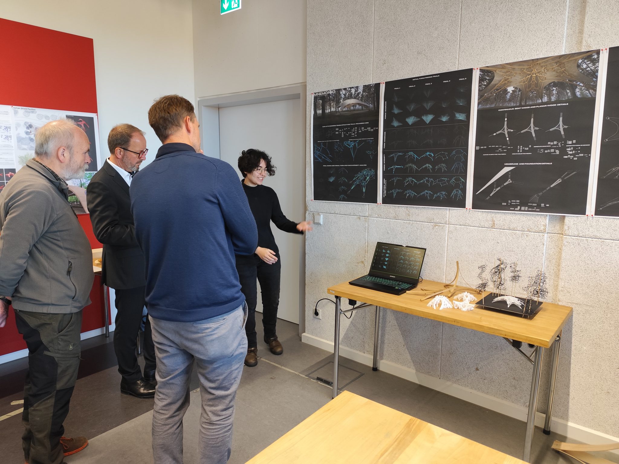 On October 11th 2025, the final presentation of the Friedwald Pavilion project took place at the Detmold School of Design, TH OWL, with representatives from Landesverband Lippe e.V., including chairman Mr. Düning-Gast and district forester Mr. Homuth, in attendance. This event marked the final of a design challenge supported by Landesverband Lippe e.V., which generously provided prize money for the winning proposals. The jury, consisting of project supporters, guests, and experts Álvaro Valderrama and Hans Sachs from TH OWL, selected four outstanding designs from the submissions.