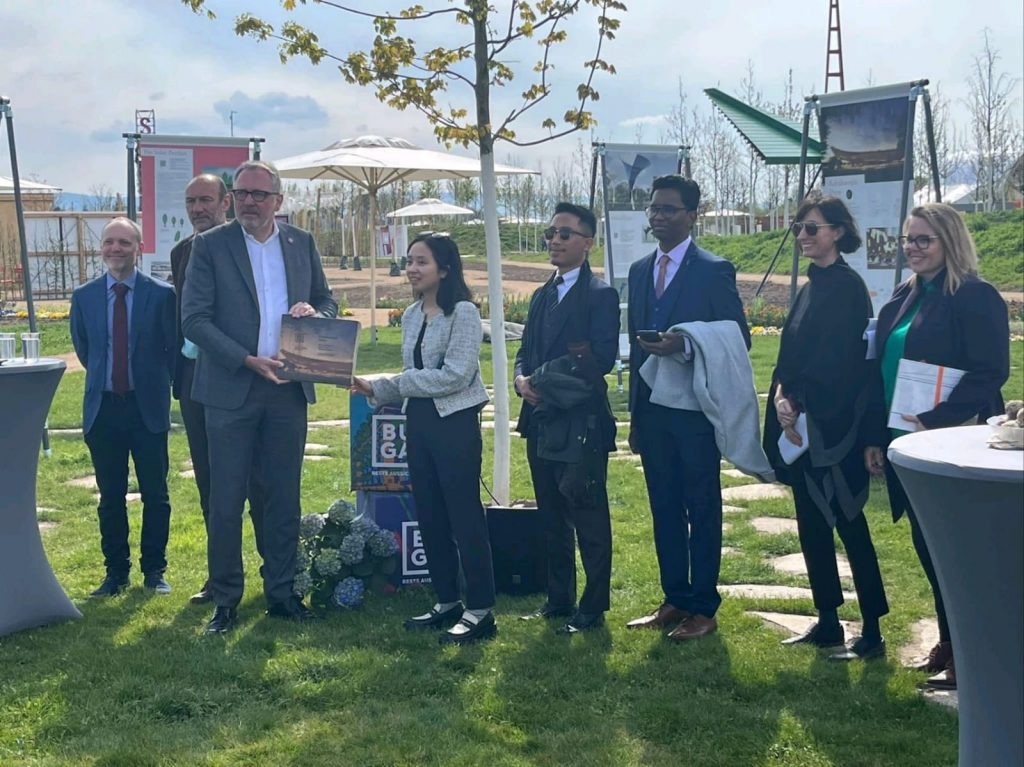 MID students win 2nd prize at Lagi Competition at Buga Mannheim 2023. Congratulations to the 2nd place winning team behind “Kaleidoscopic Dune,” Muny-Roth Chev, Jason Daniel, and Vatsapol Nanta. In the image from left to right: the MID-team, Elizabeth Monoian (LAGI Founding director), Michael Schnellbach (CEO BUGA 2023), Peter Kurz (Mayor of the city of Mannheim), Robert Ferry (LAGI founding director), Yi Yang Chai (First place award), Tina Nailor (Site Project manager BUGA 2023)