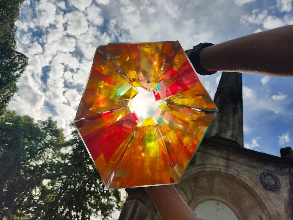 A complete dune system consists of more than 70 repeating hexagonal kaleidoscope modules of reclaimed wood that are coupled in a simple interlocking system. Within each module, colored glass and reflective glass create a kaleidoscope effect for the enjoyment of visitors below. Rising from the center of each kaleidoscope module, a sun-catching cone operates with a dual-axis solar tracking system to align with the position of the sun throughout the day. Each sun-catching cone contains a high performance, multi-junction solar cell that collects the concentrated sunlight from the Fresnel lens at the cone opening and converts it into electricity. A heat sink system keeps the solar cells operating at peak efficiency.