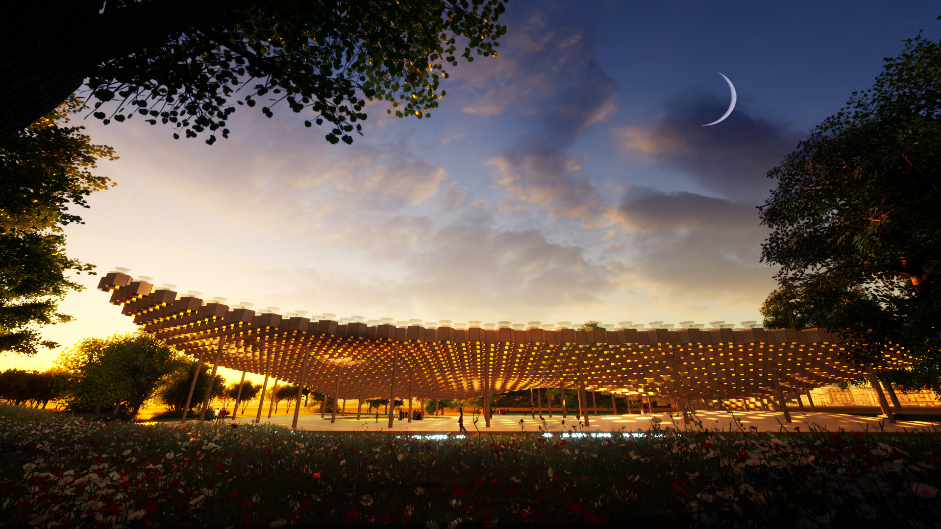 “Kaleidoscopic Dune” explores how technology, art, and light merge to define sustainable living in the twenty-first century. Incorporating light as a sculptural and experiential element, the artwork is a modular system of energy generation that is quickly assembled in a variety of forms made from sustainable materials. A system of tensile support masts allows for large open spaces. The flexibility of the structure can accommodate public functions as well as spaces for private gardens, a playground, and an observatory.