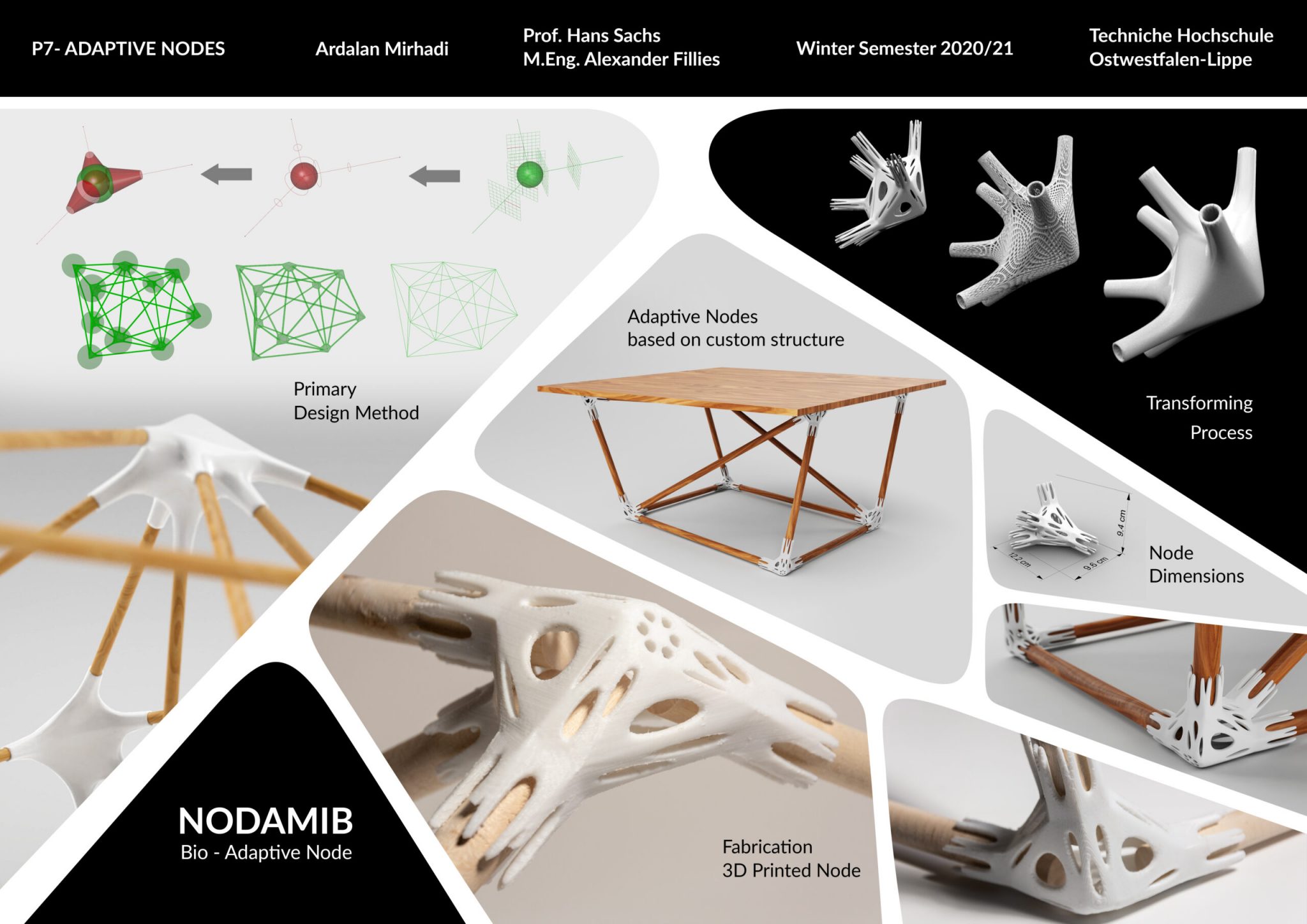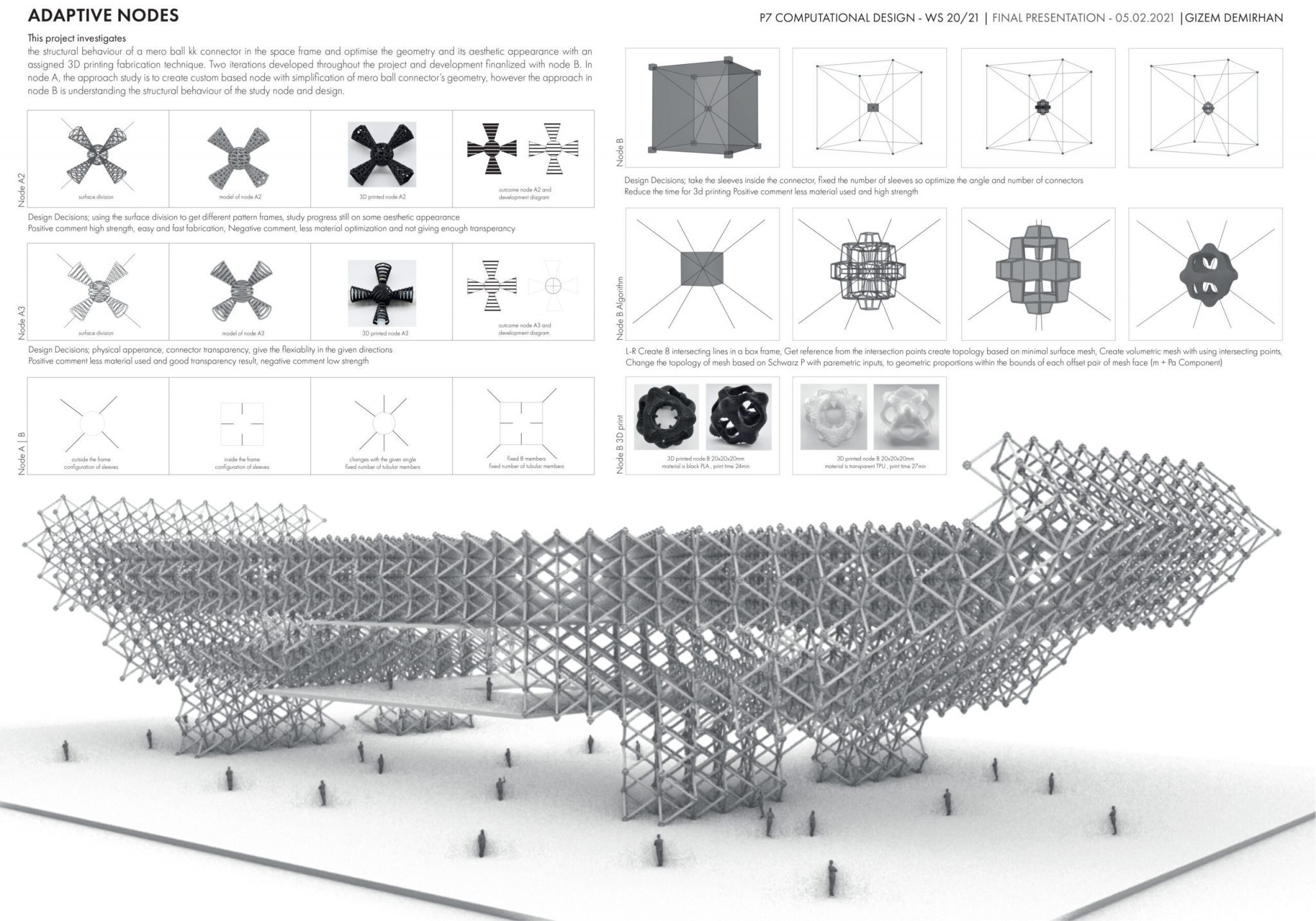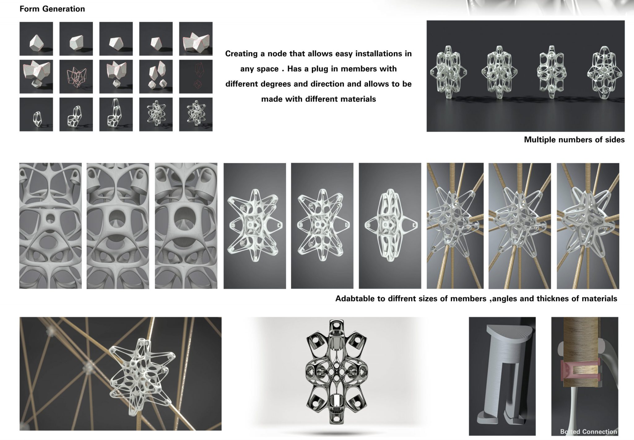 The lecture aims to enhance the design flexibility, structural performance and aesthetic appearance of space frame structures using 3D printed nodes. The design process focuses mainly on the frame and the node. 3d printing enables the development of complex geometric structures without standardizing the elements. The nodes can be unique parts for an optimal development in terms of geometry and material. This design freedom presents challenges of designing the optimum geometric frame and node and also the systematic organization of the information and physical parts.