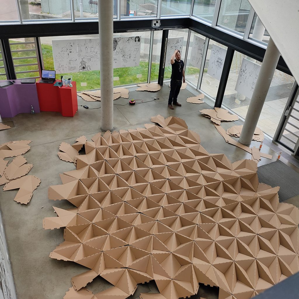 This Expertise course held over one week on the HS Anhalt Camous in the direct neighbourhood of the historic Bauhaus in Dessau was a deep dive into creation and construction. A group of Master students from the Dessau Department of Design and the Detmold School of Design embarked on an adventure to parametrically design and digitally fabricate 1:1 pavilions, structures and installations using corrugated cardboard. The three teams delved into the exploration of material and geometry-driven form creation, employing algorithmic thinking and design tools like Rhino and Grasshopper. Large-scale digital fabrication was achieved using laser-cutters. Finally each group designed and produced stable, self-standing, and visually striking structural systems. These were subsequently installed and exhibited on campus in Dessau.