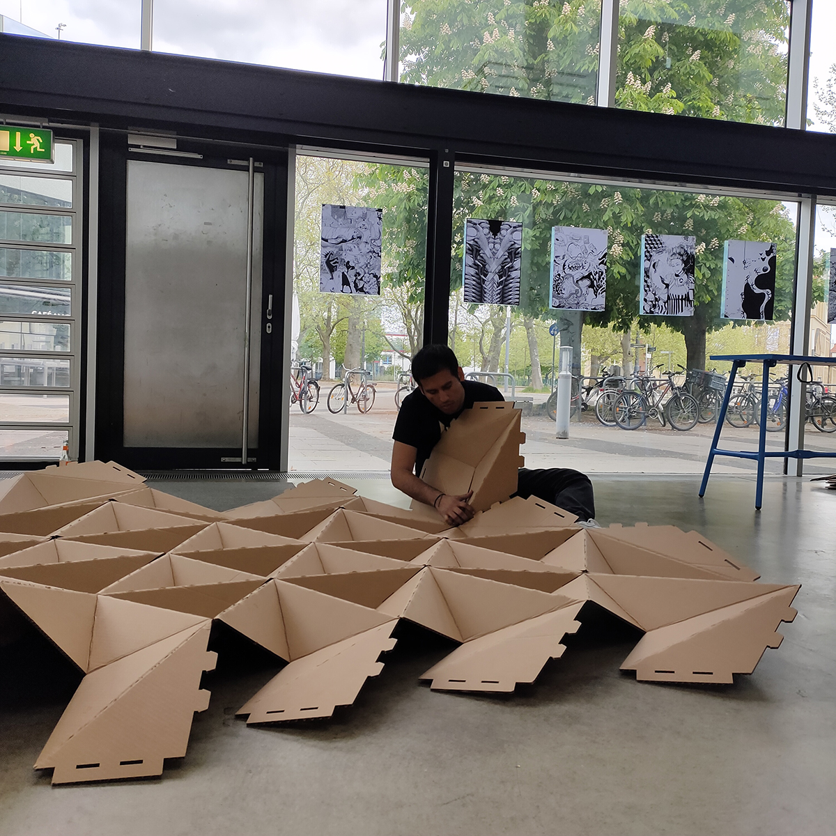 This Expertise course held over one week was a deep dive into creation and construction. A group of Master students from the Dessau Department of Design and the Detmold School of Design embarked on an adventure to parametrically design and digitally fabricate 1:1 pavilions, structures and installations using corrugated cardboard. The three teams delved into the exploration of material and geometry-driven form creation, employing algorithmic thinking and design tools like Rhino and Grasshopper. Large-scale digital fabrication was achieved using laser-cutters. Finally each group designed and produced stable, self-standing, and visually striking structural systems. These were subsequently installed and exhibited on campus in Dessau.