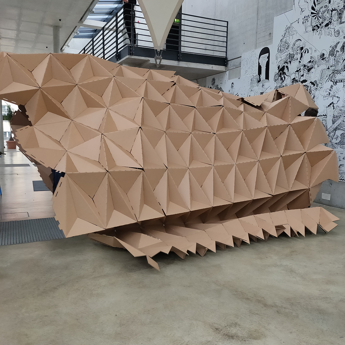 Corrugated cardboard has proven its worth as a surprisingly versatile building material. Despite being fundamentally composed of paper, it exhibits exceptional stability due to its inherent structural design. This fascinating attribute has encouraged many designers to use it in creative explorations, culminating in stunning works ranging from furniture to full-scale pavilions. In our journey, we aimed to push the boundaries of what this material could accomplish. Our objective was to devise a generator capable of segmenting any given shape into panels, each with its own unique cut and fold pattern. The hope was to bolster stability through surface triangulation and the intrinsic tensile and compressive forces acting upon the structure.