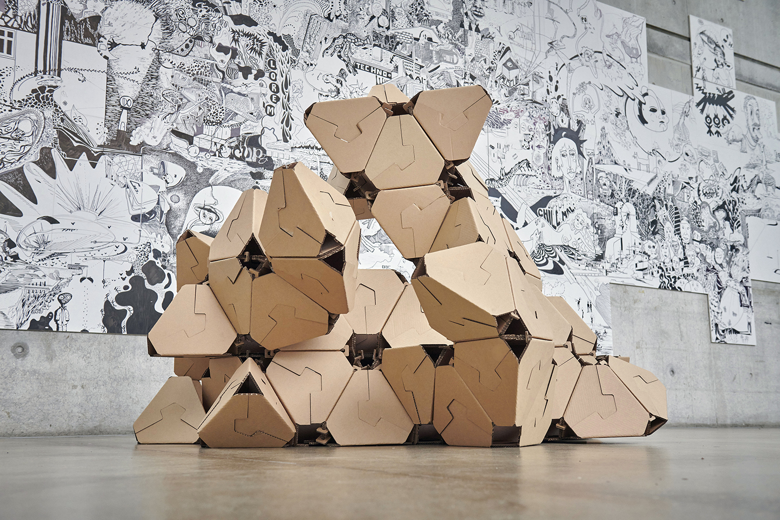 Corrugated cardboard has proven its worth as a surprisingly versatile building material. Despite being fundamentally composed of paper, it exhibits exceptional stability due to its inherent structural design. This fascinating attribute has encouraged many designers to use it in creative explorations, culminating in stunning works ranging from furniture to full-scale pavilions. In our journey, we aimed to push the boundaries of what this material could accomplish. Our objective was to devise a generator capable of segmenting any given shape into panels, each with its own unique cut and fold pattern. The hope was to bolster stability through surface triangulation and the intrinsic tensile and compressive forces acting upon the structure.