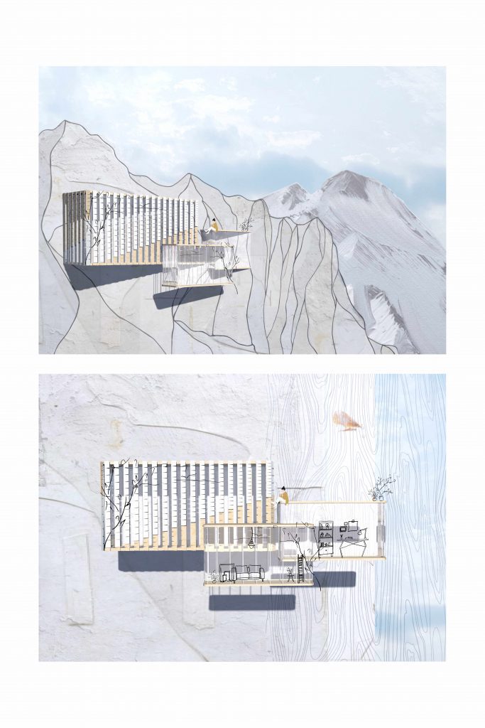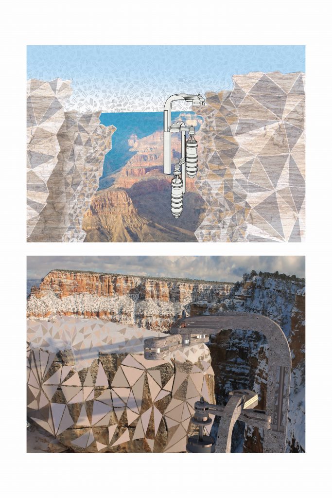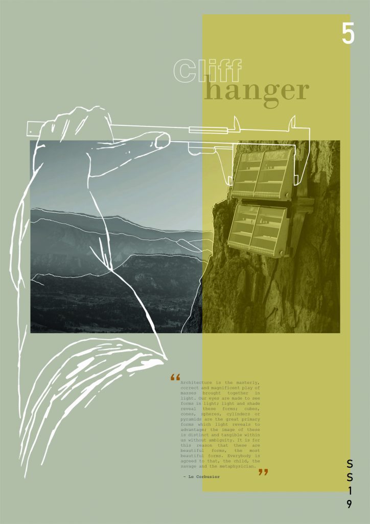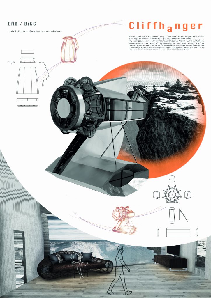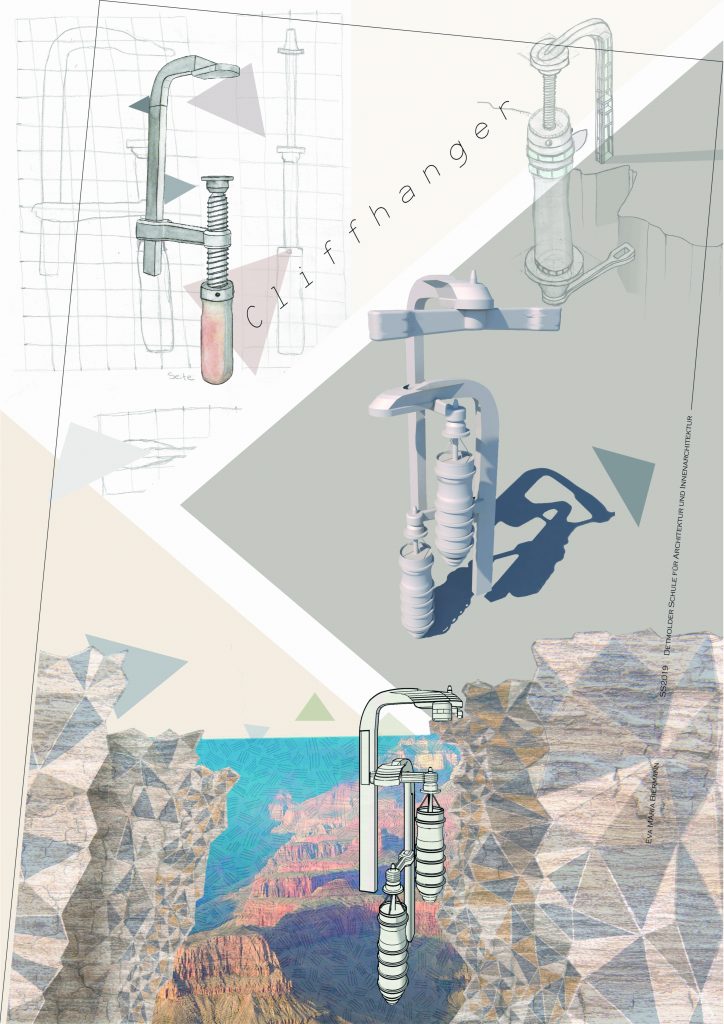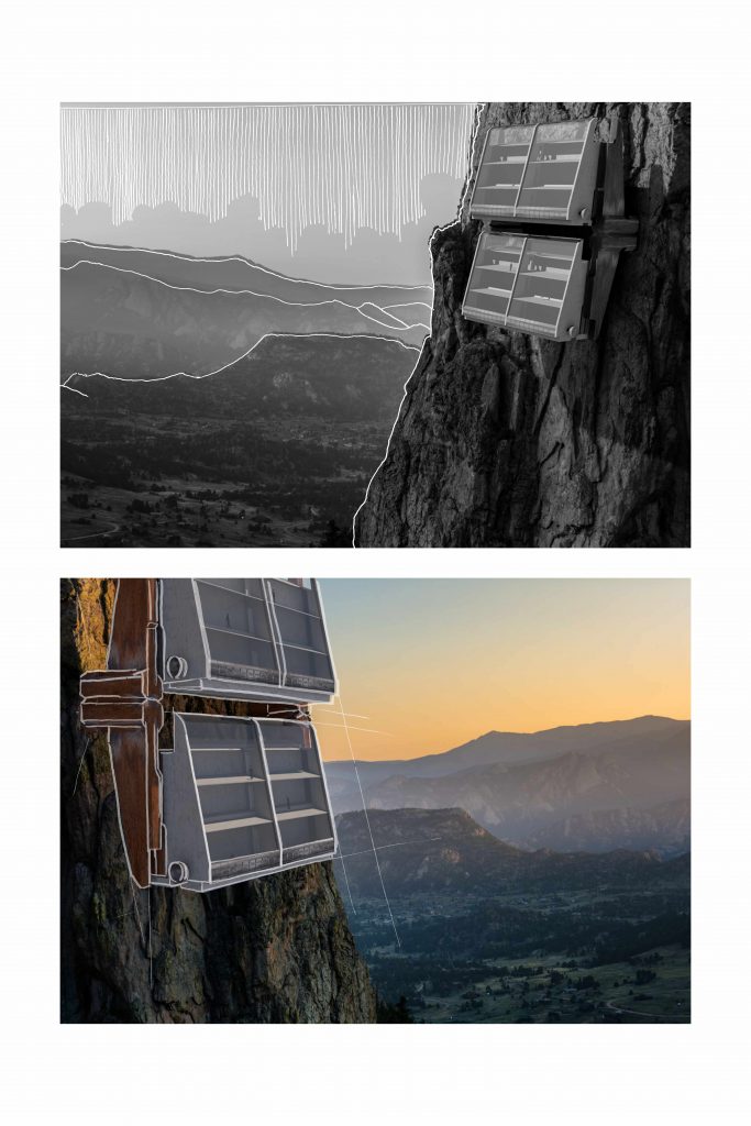 The second tasks aims to transform the 3D-modelled object from task 1 into an imaginative architecture, altering the object into a “cliffhanger”. The emphasis is on visualising the structure and it´s surroundings, using different digital tools (Affinity Photo, Photoshop, etc.) as well as analogue tools, such as hand-drawn sketches.