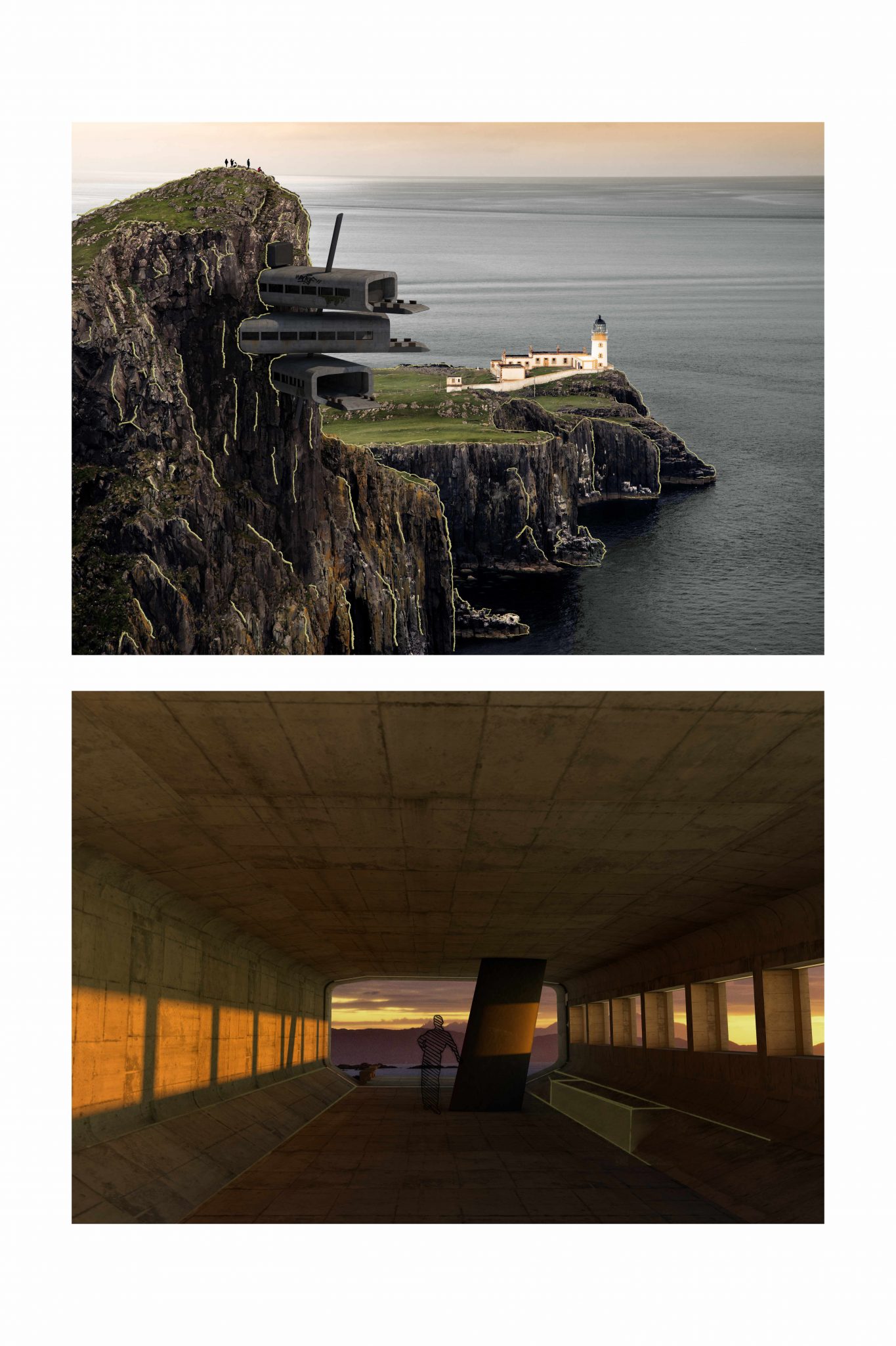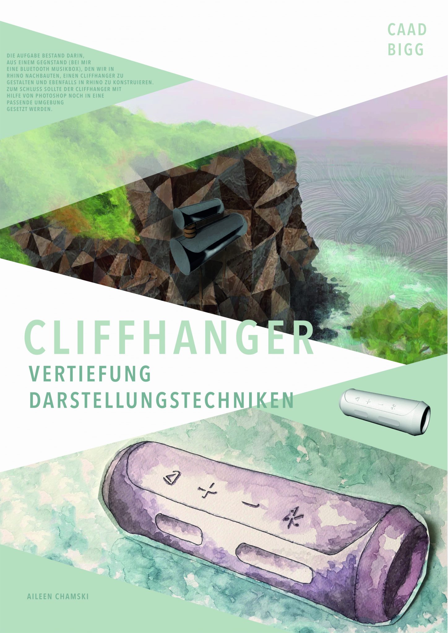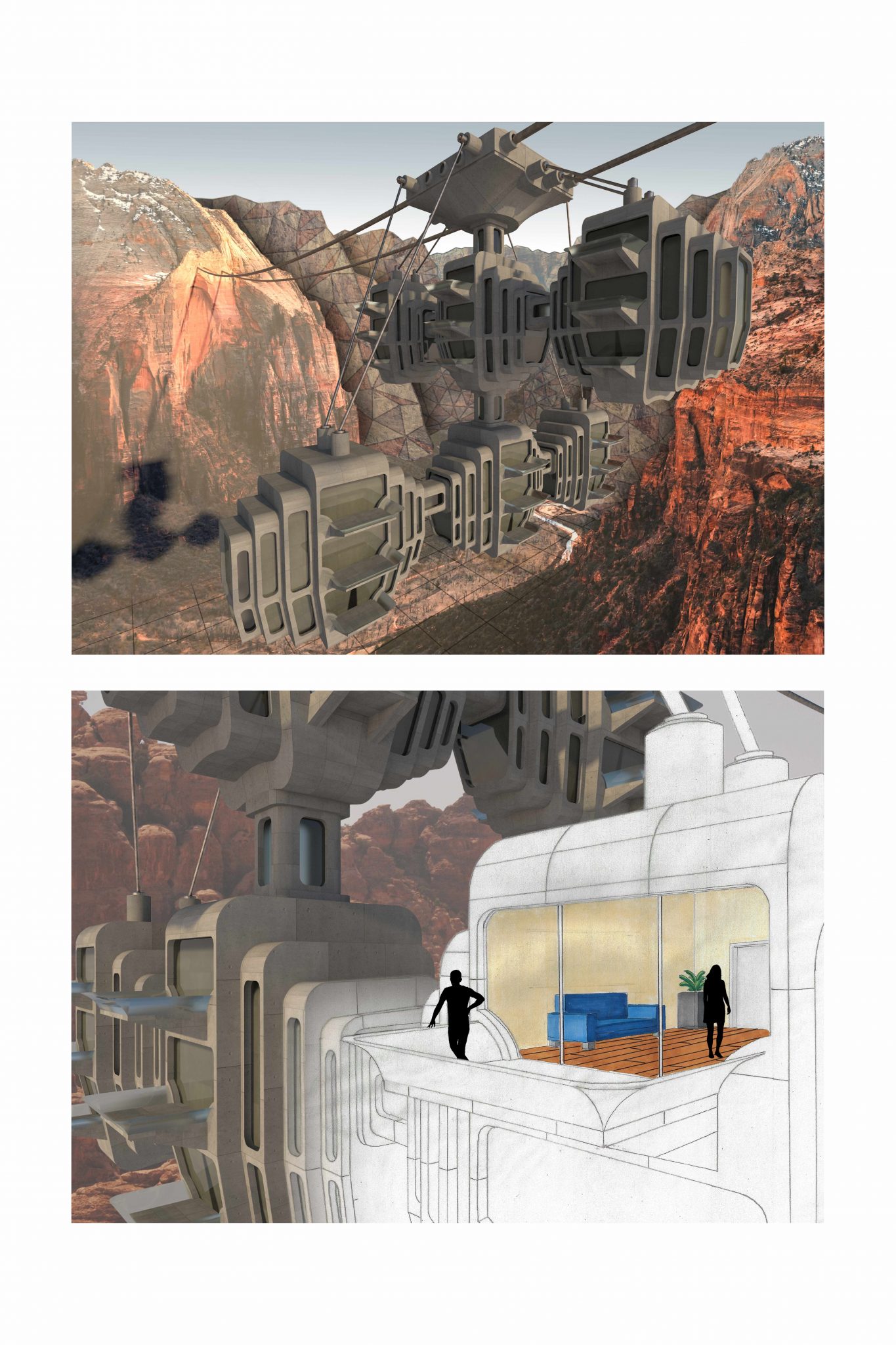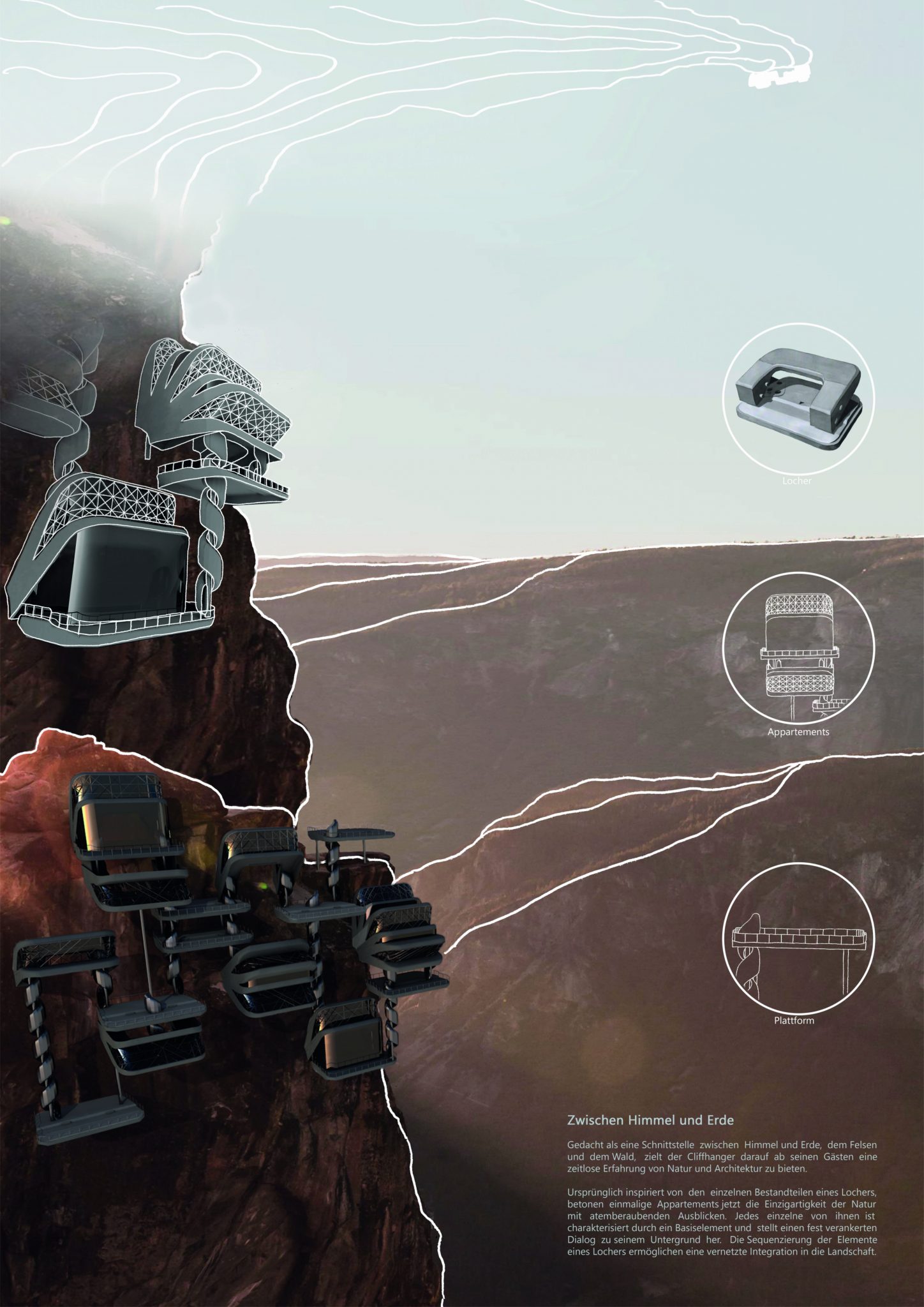 The second tasks aims to transform the 3D-modelled object from task 1 into an imaginative architecture, altering the object into a “cliffhanger”. The emphasis is on visualising the structure and it´s surroundings, using different digital tools (Affinity Photo, Photoshop, etc.) as well as analogue tools, such as hand-drawn sketches.