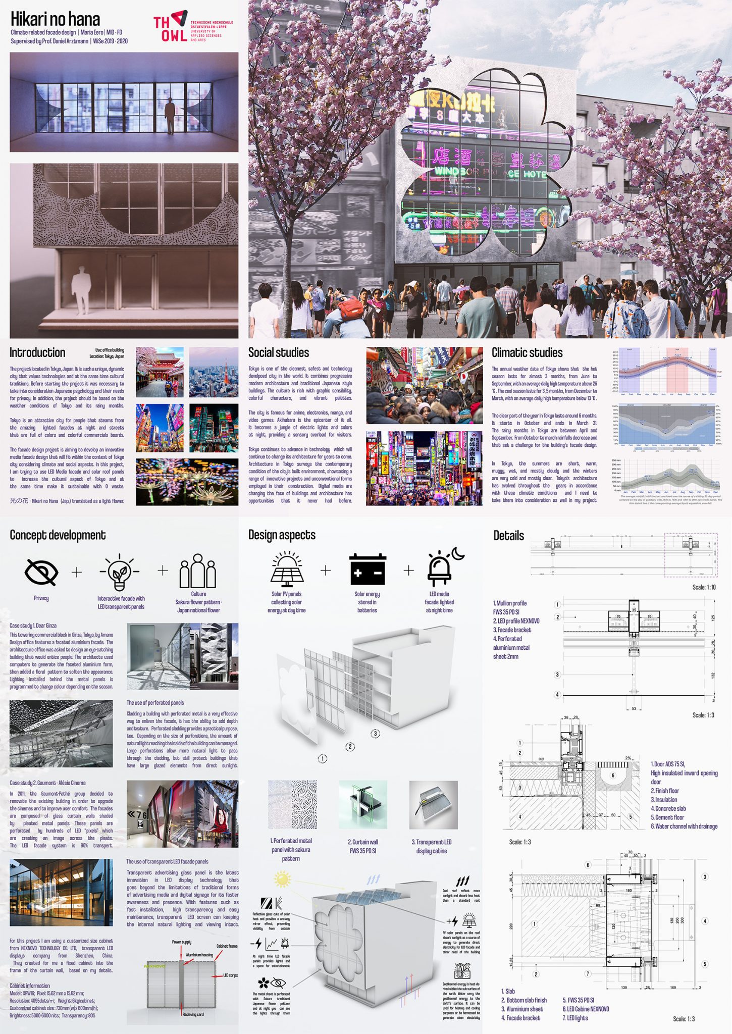 The goal of the project is to gain knowledge about system solutions and learn how to develop project-specific facades (custom solutions). Learn about management, project design and planning with regard to ecological and economical aspects as well as regulations and standards. Specific understanding of construction technologies, (fabrication, assembling and installation) for facade systems. Layout of details and constructional drafts and sections with CAD software tools.