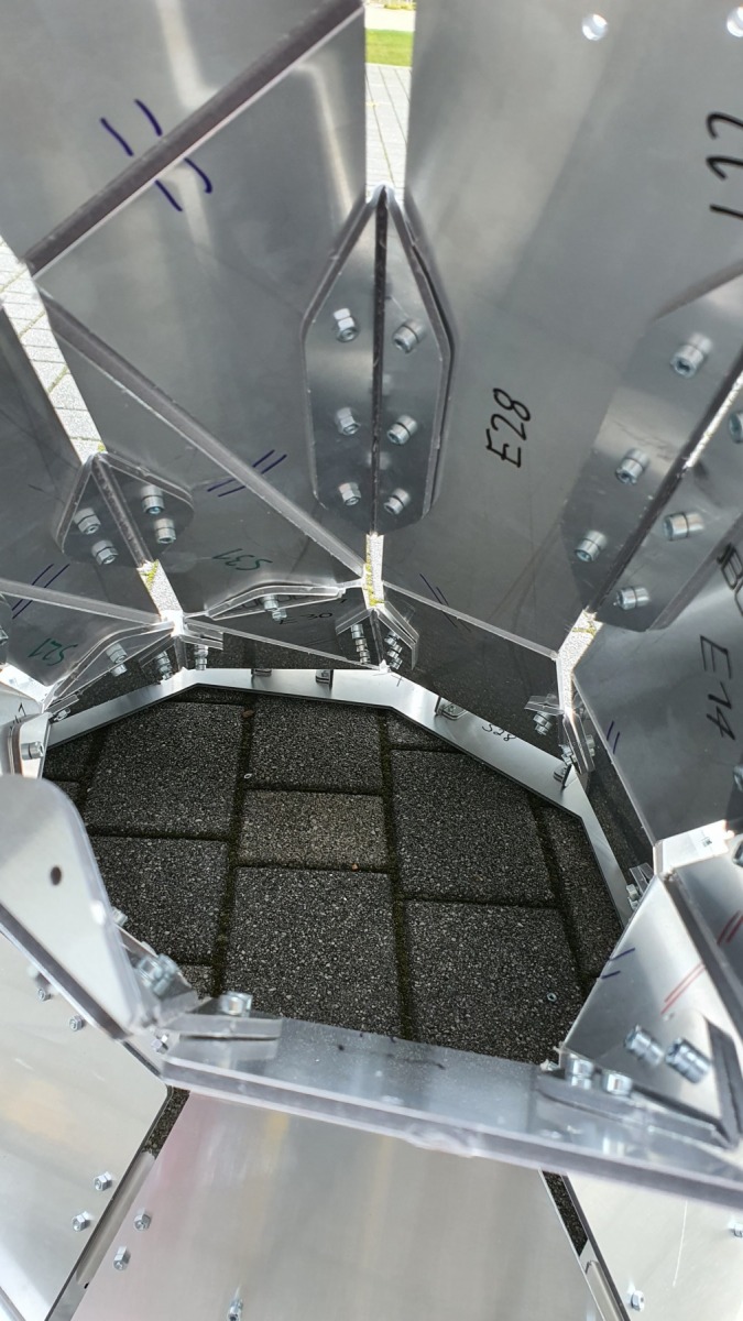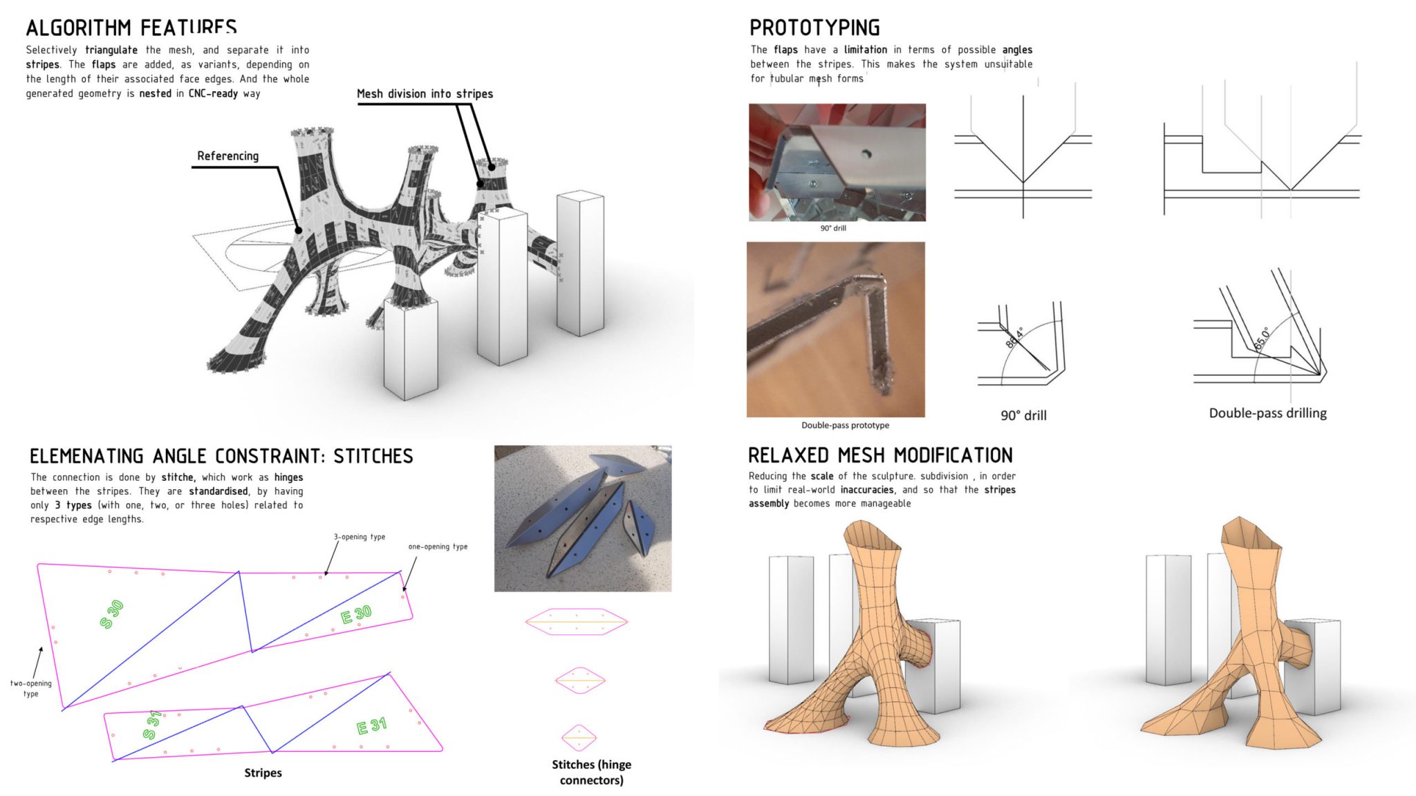 Called “Space Mesh”, the sculpture is designed to compose more dynamically with its site, while omitting the principle of platonic solids, and only maintaining the relaxed mesh one. And this, in order to avoid acute angles between stripes. By reducing the original scale of the sculpture, subdivision in order to limit real-world inaccuracies, and so that the stripes assembly becomes more manageable.