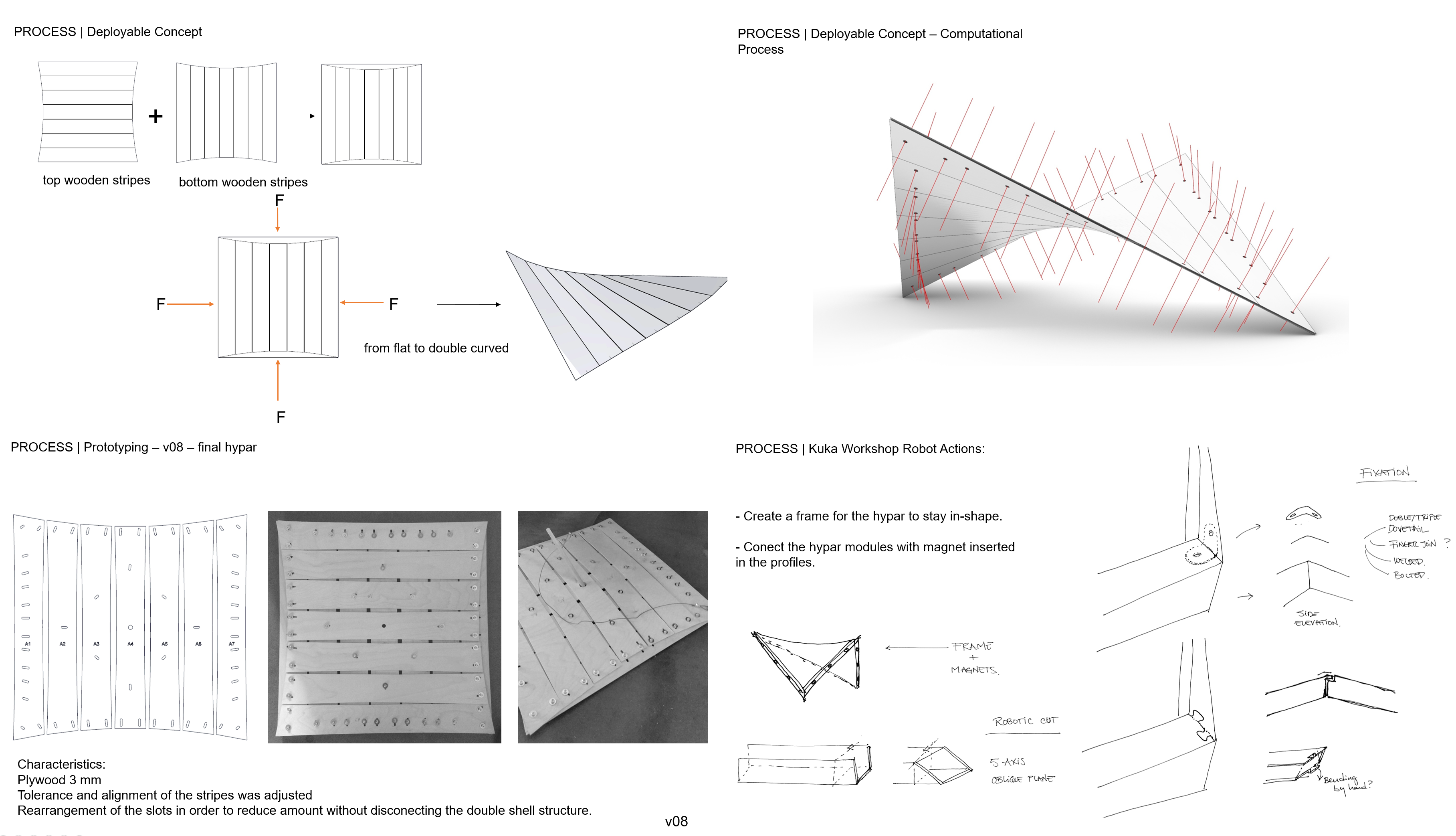 The task was to develop a digital fabricated, double-curved structure. Divided into two groups, the students focused on wood and Alucobond. The prototypes were created using CNC and laser-cutters and were treated in a final step with an industrial robot.