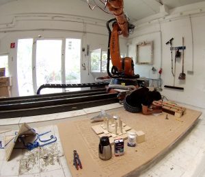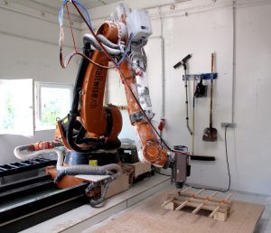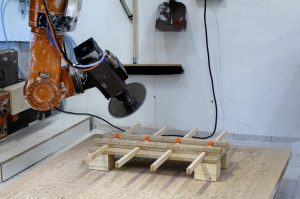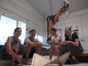 The module DIGITAL FABRICATION provides the connection and potential of computer-controlled production processes in combination with rule-based design and construction methods. Students worked on this project on several workshop days. It started with hands-on approaches and simple-to-apply computational tools, such as CNC cutters and folding/bending techniques, and ended in more complex and sophisticated approaches with a 7-axis industrial robot.