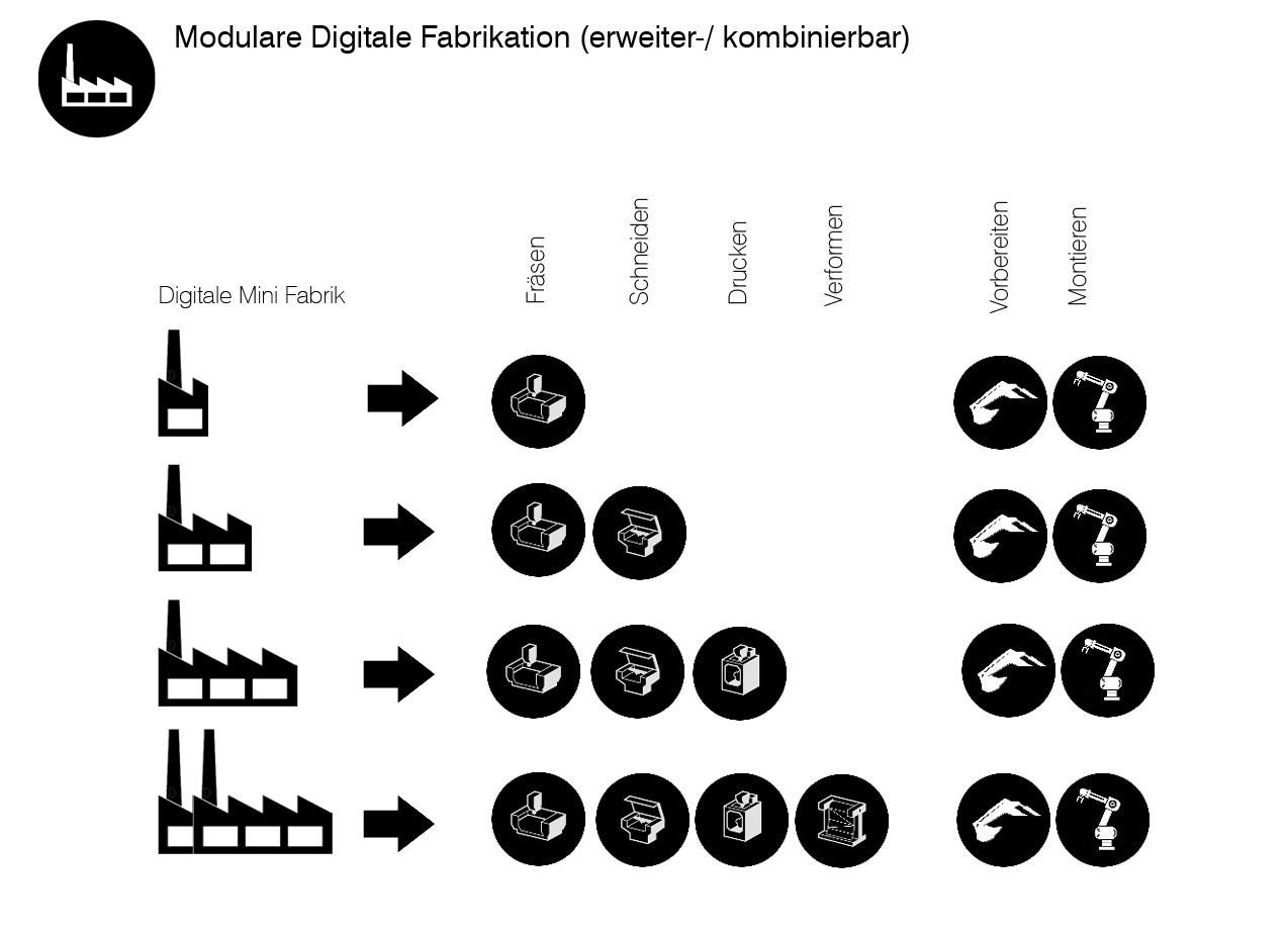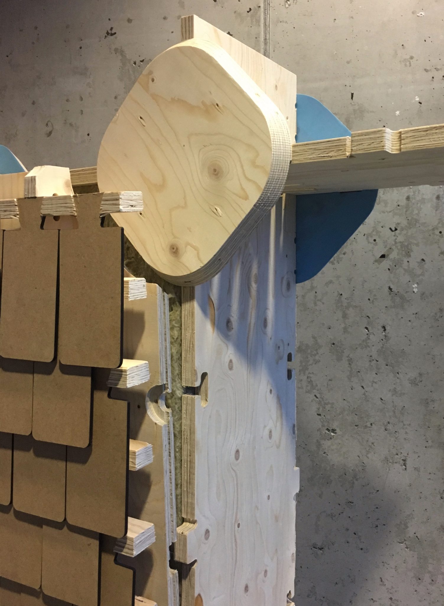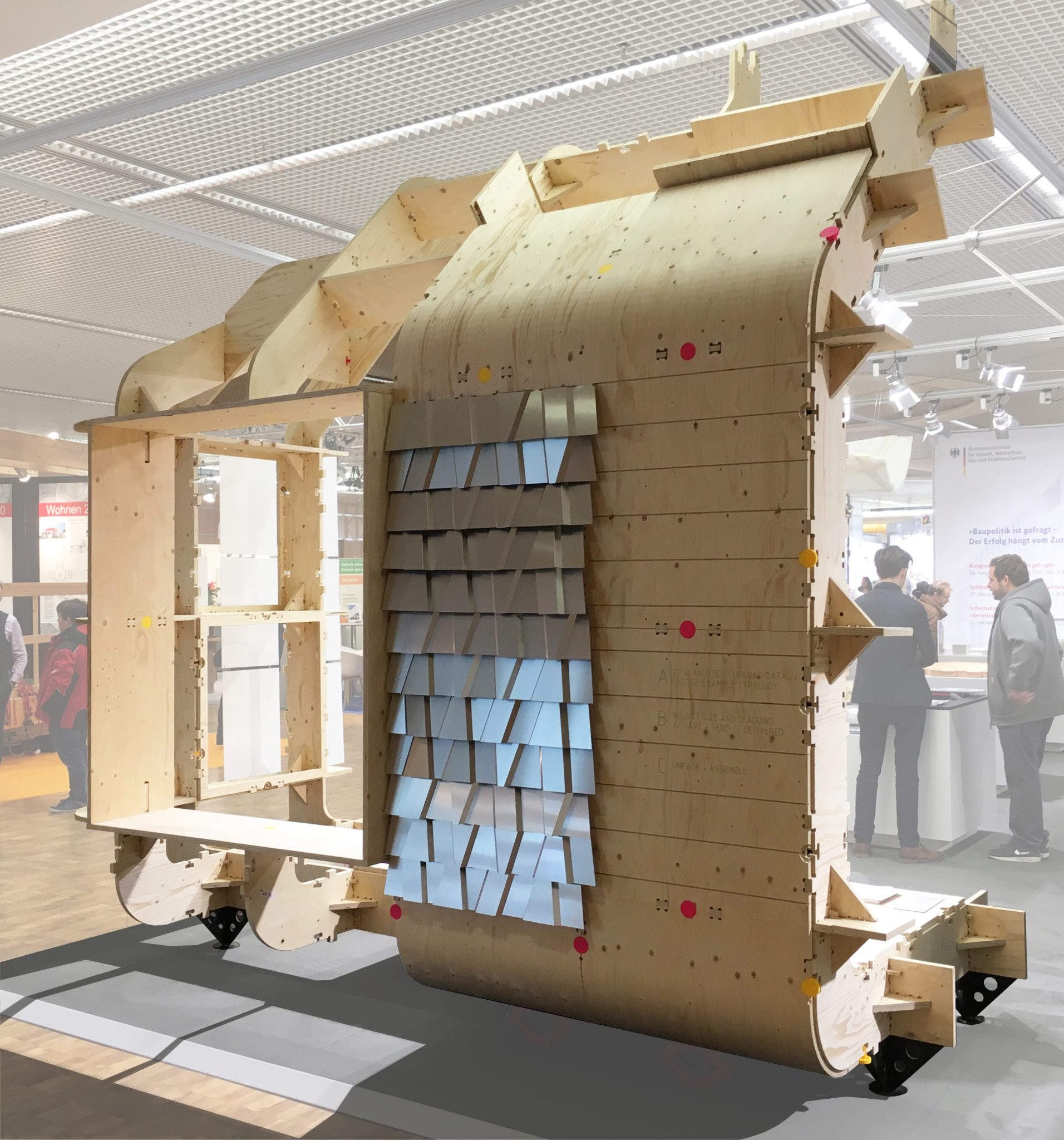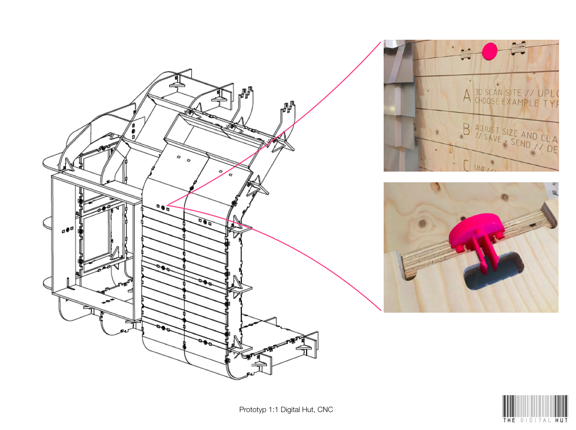 The aim of the research project was to design and produce a “minimal house prototype” using digital technologies in development and production. In the multi-phase project, digital production methods were used to develop a variable and reduced lightweight construction system that can be configured (via app) and erected by the user without the use of complex tools. Through the use of innovative material processing and the use of sustainable building materials in combination with an adaptive spatial concept, a particular attempt was made to meet the requirements of a mobile and networked society. The main focus here is on the connection of (software) interfaces: user collaboration (principles of “open innovation” and “mass customization”), local, digitized fabrication and the customized design / production of high-quality spaces.
