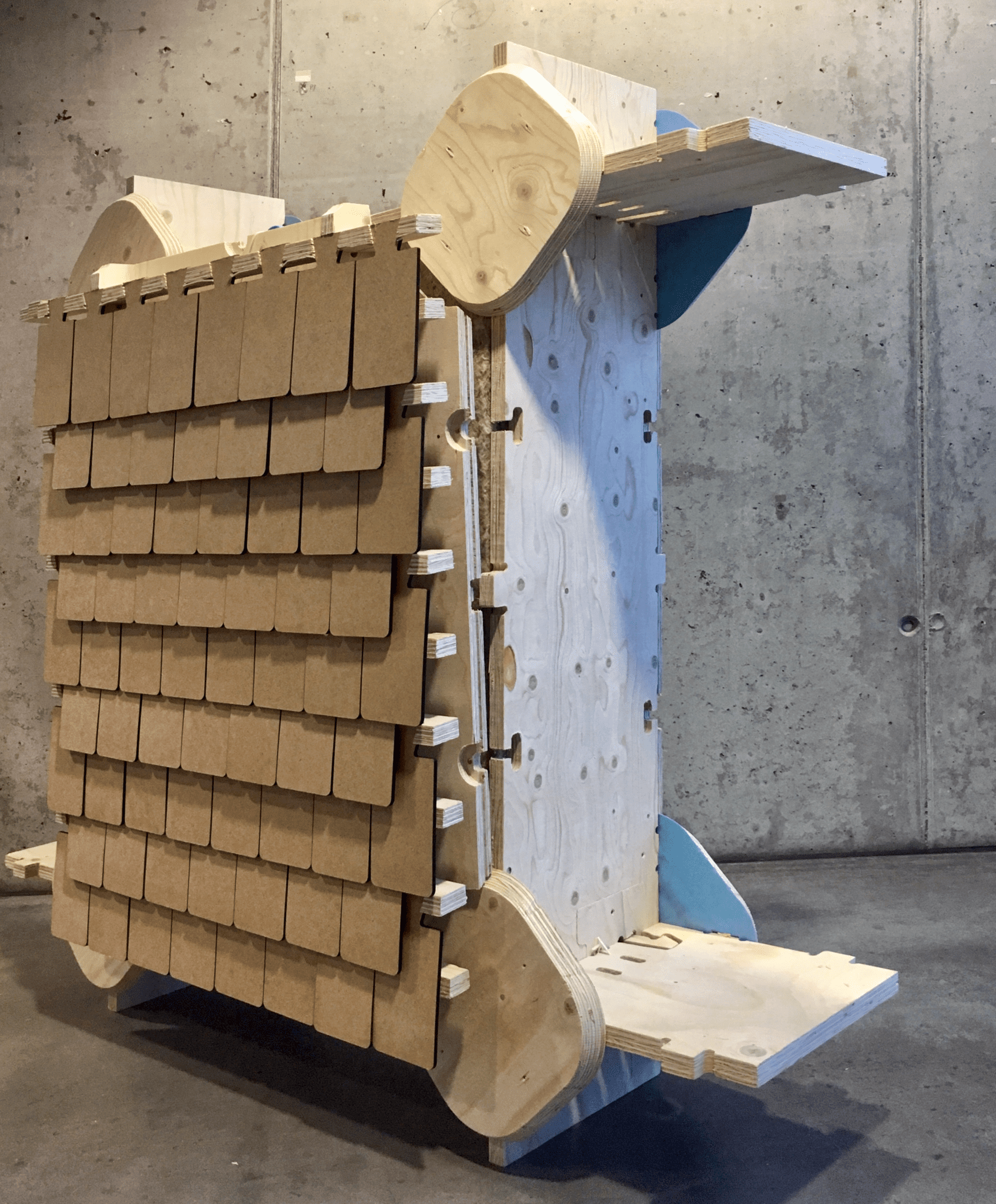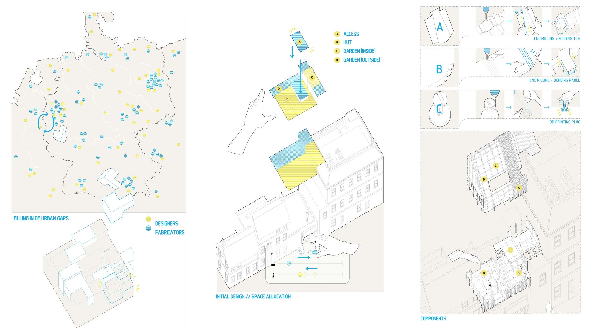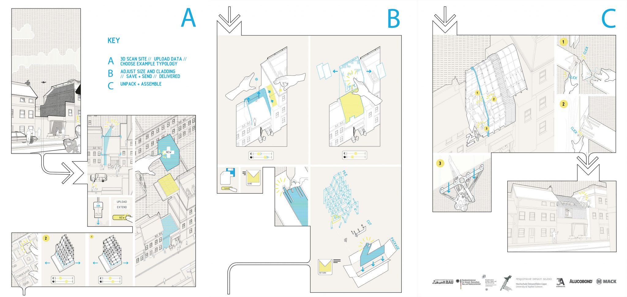 The aim of the research project was to design and produce a “minimal house prototype” using digital technologies in development and production. In the multi-phase project, digital production methods were used to develop a variable and reduced lightweight construction system that can be configured (via app) and erected by the user without the use of complex tools. Through the use of innovative material processing and the use of sustainable building materials in combination with an adaptive spatial concept, a particular attempt was made to meet the requirements of a mobile and networked society. The main focus here is on the connection of (software) interfaces: user collaboration (principles of “open innovation” and “mass customization”), local, digitized fabrication and the customized design / production of high-quality spaces.