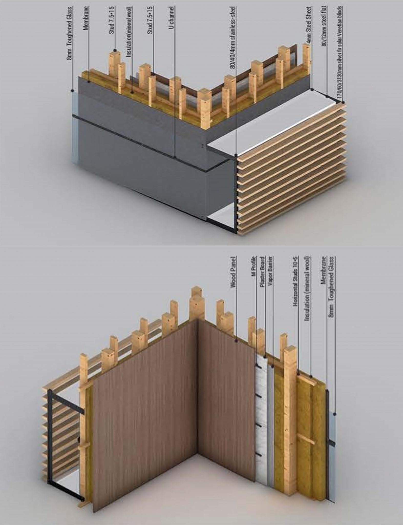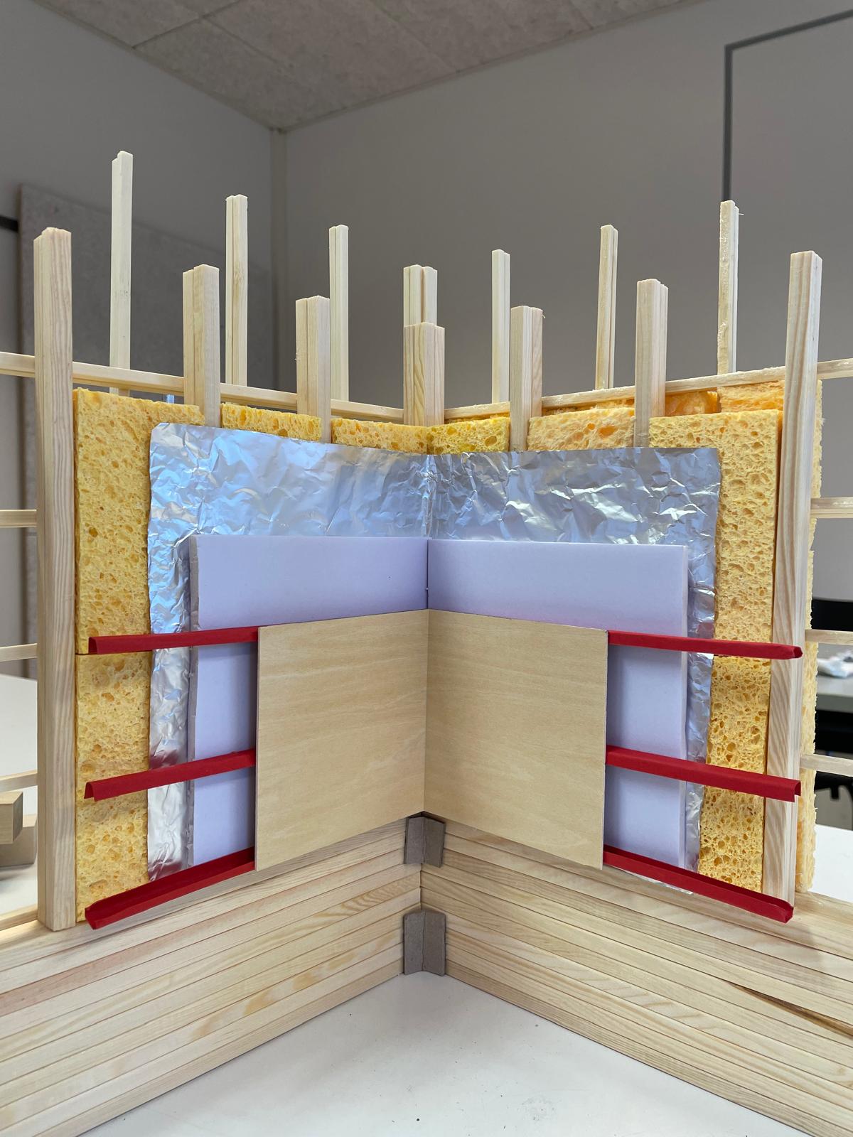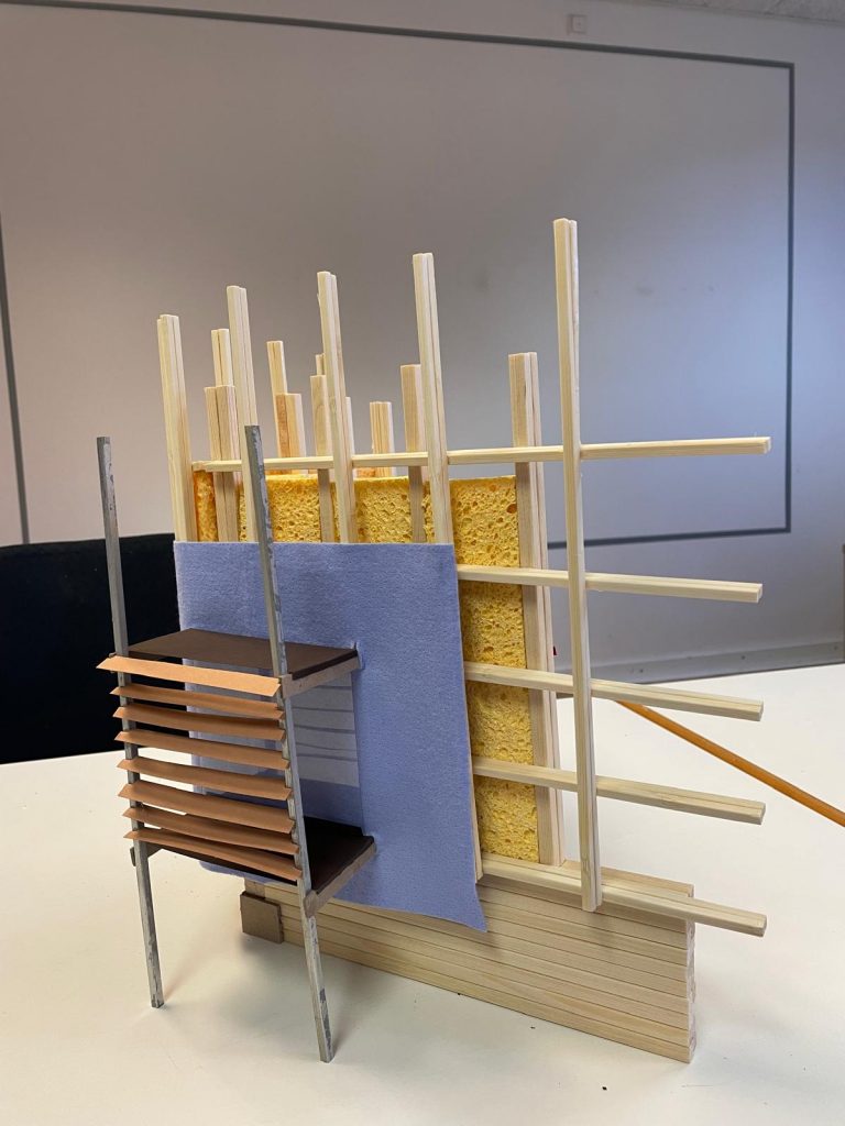 The students used 3D models and technical drawings to build a 1:10 physical model showcasing opaque façade strategies. This hands-on process deepened their grasp of facade technologies and building physics.