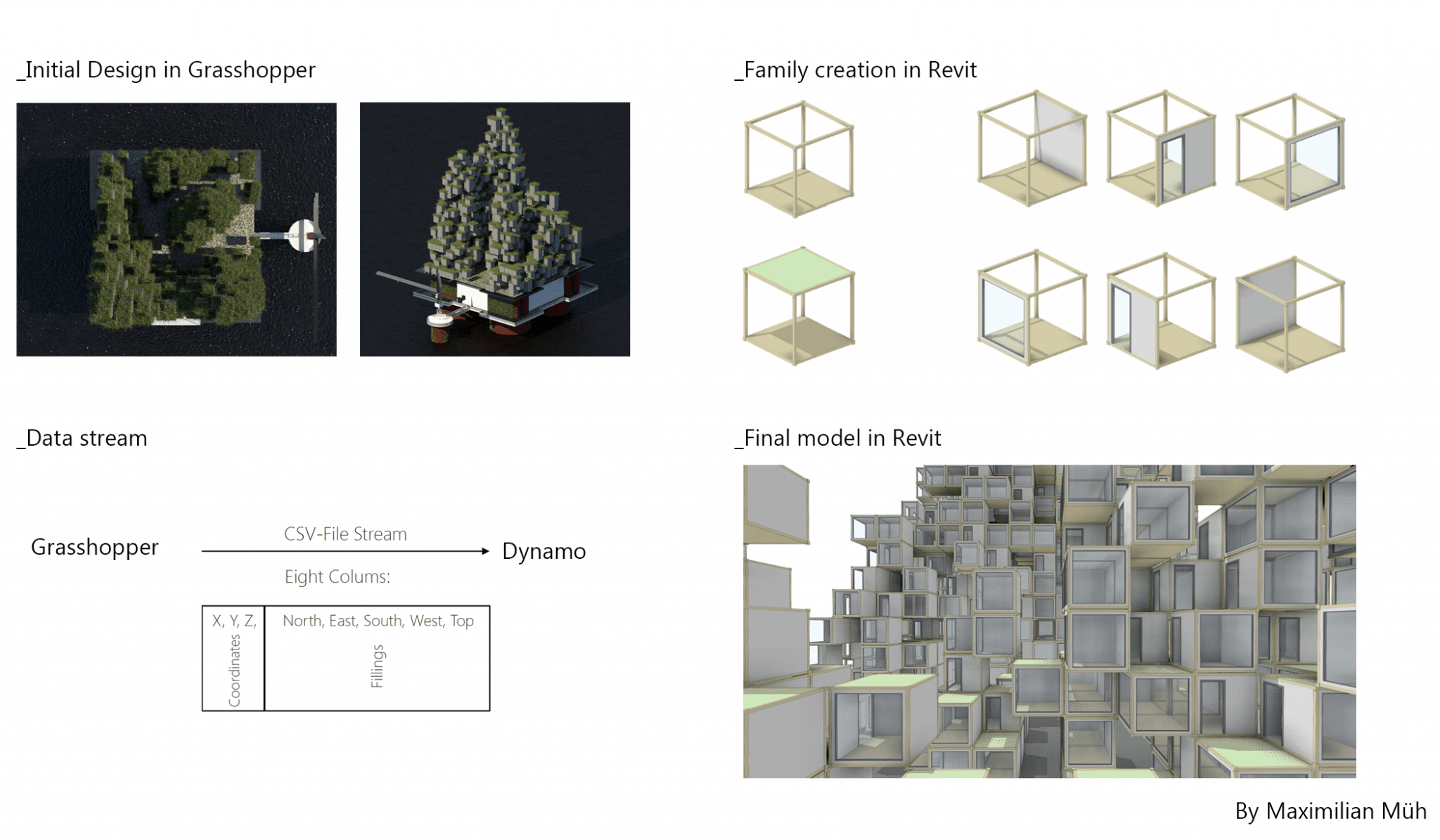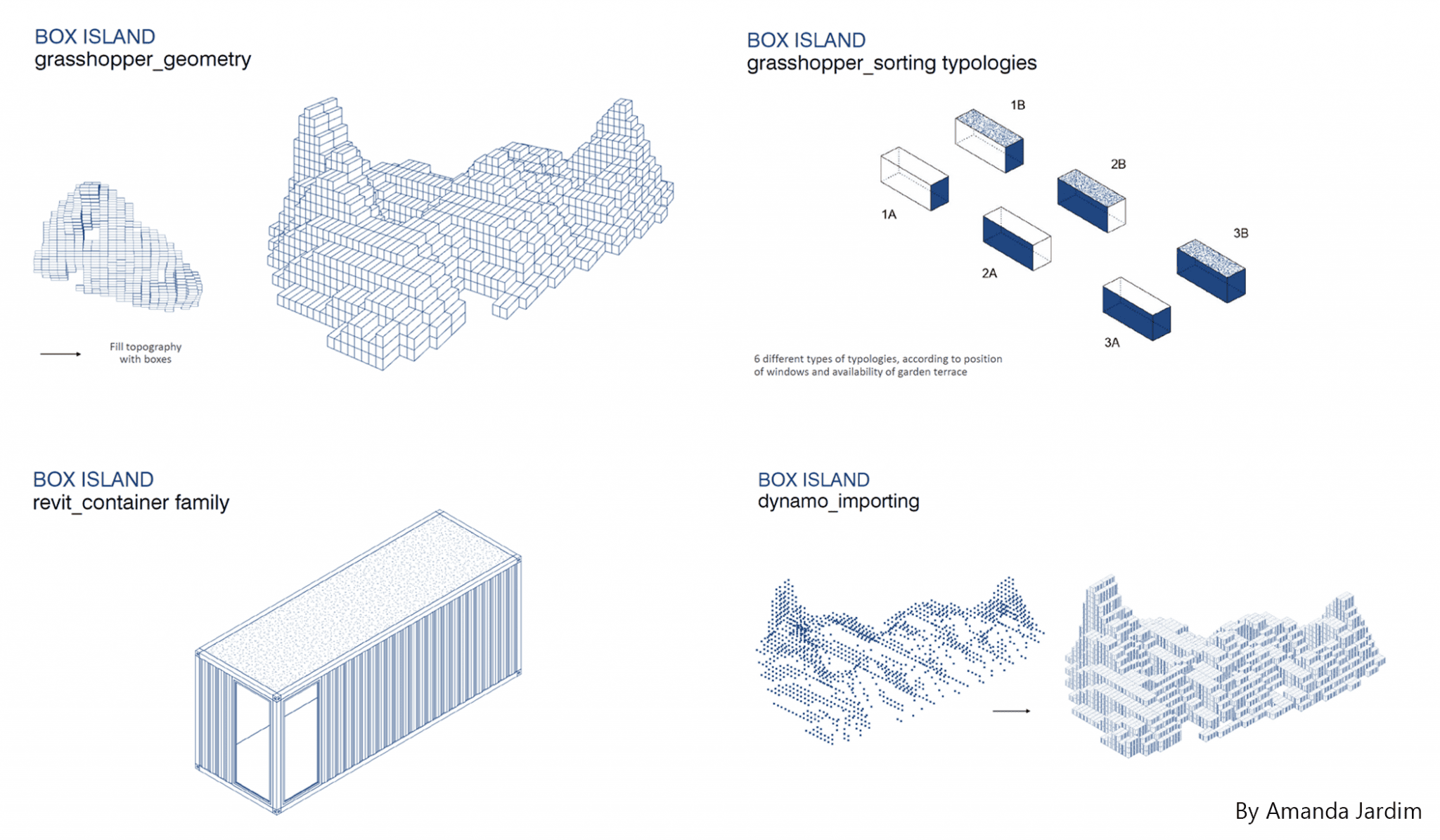 In Revit, the students had to make the abstract designs become actual architecture, using the possibilities of BIM, Data management and parametric design. The families created in Revit enabled the students to change the appearance of each box, according to location and surrounding. It shows the possibilities of modern BIM and parametric design.