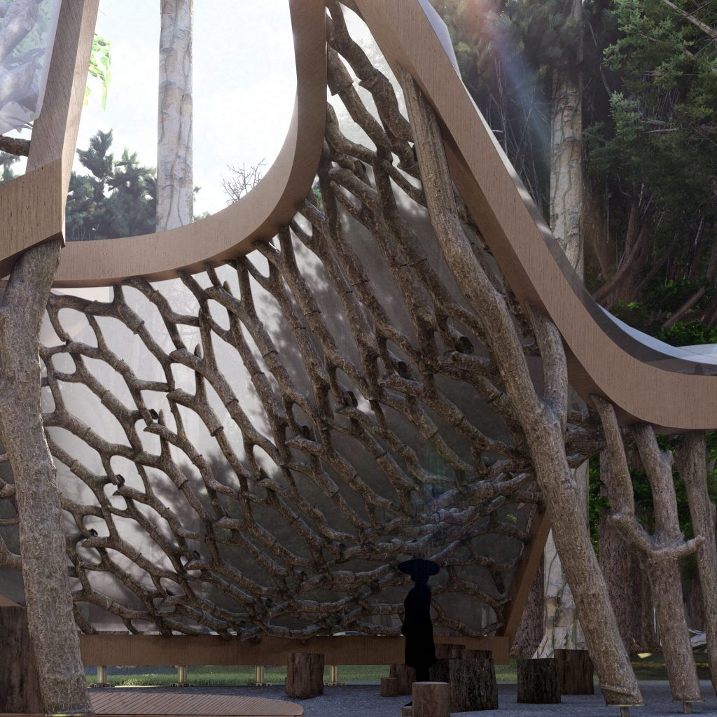 In this project by Farah Gheith, Pegah Khademi, and Fady Mahrous, traditional craftsmanship of the NRW region, Nieheimer Flechthecke, seamlessly merges with digital innovation. The construction process begins with scanning discarded tree to form an inventory, which are then algorithmically-aligned to match a tessellated pattern of a Minimal Surface. The outcome is a space that embodies the profound reverence of a spiritual ceremony, celebrating the life cycle of trees, and people in a poetic full-circle moment.