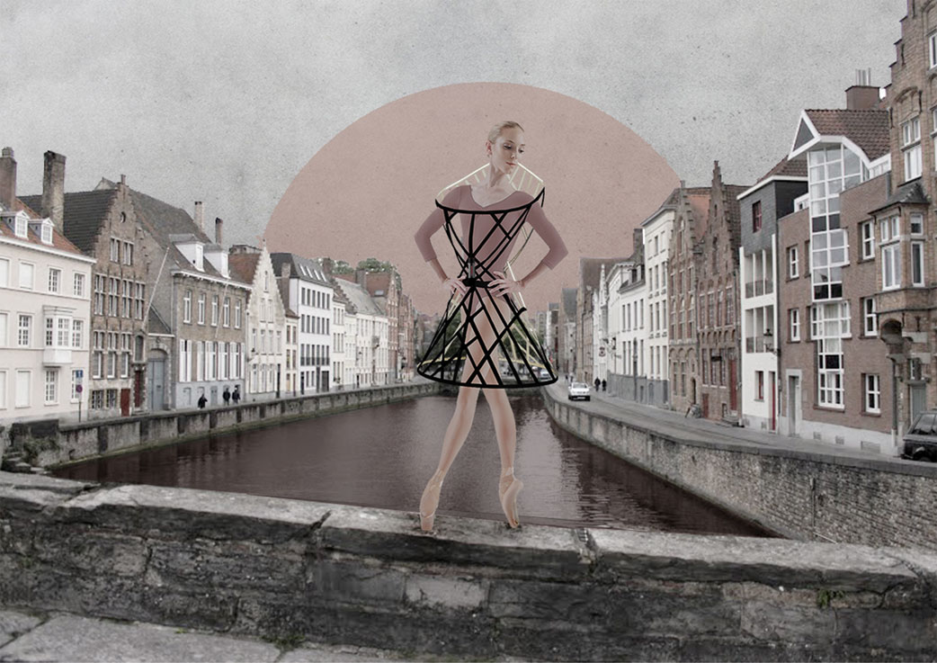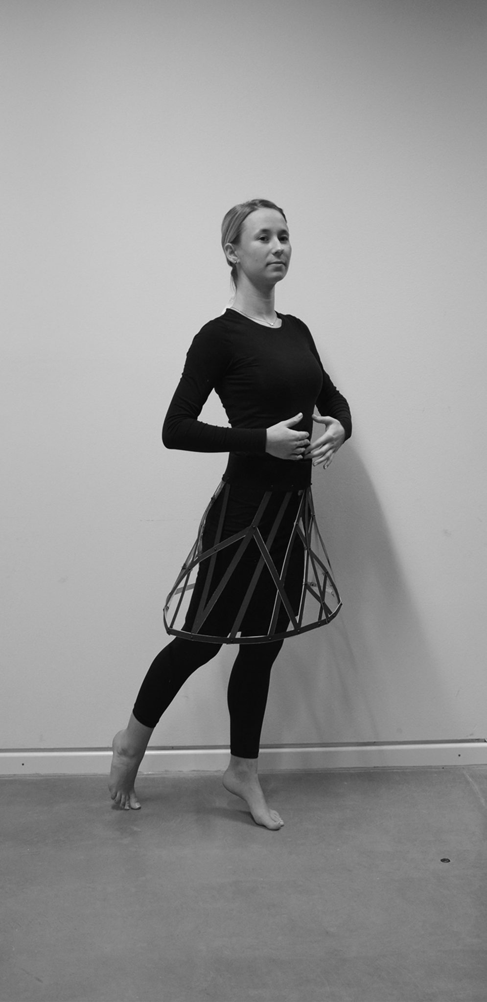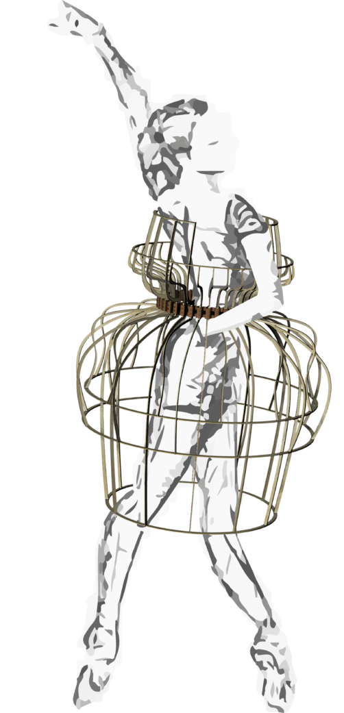 Femme is a sculptural costume designed for ballet. This is, on the one hand, constricting, so the dancer in a certain posture propose the amendment is forced. On the other hand, the costume offers a wide freedom of movement in the shoulder and waist area due to its large curved circles. The rigid frame stands in direct contrast to the dancer‘s necessary freedom of movement.