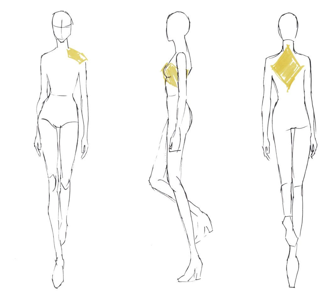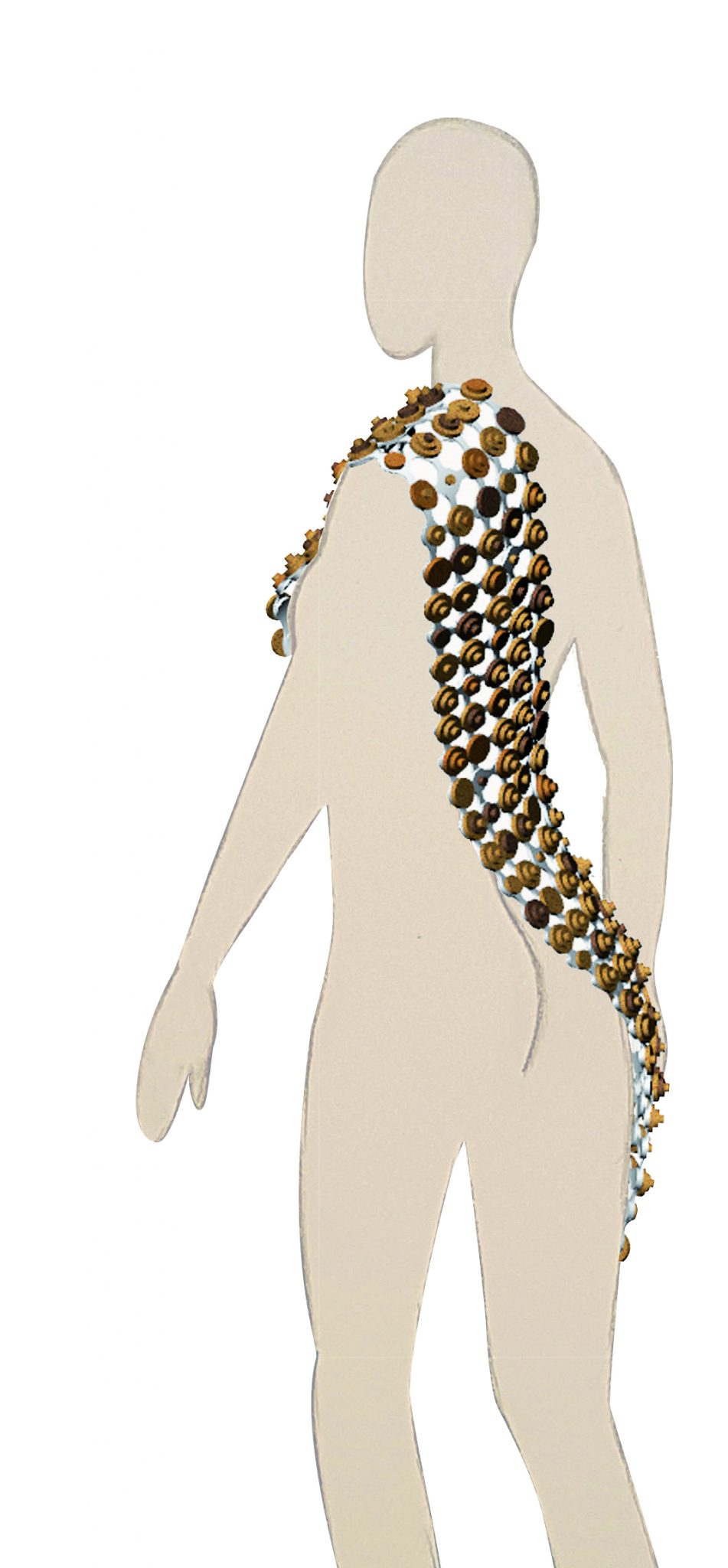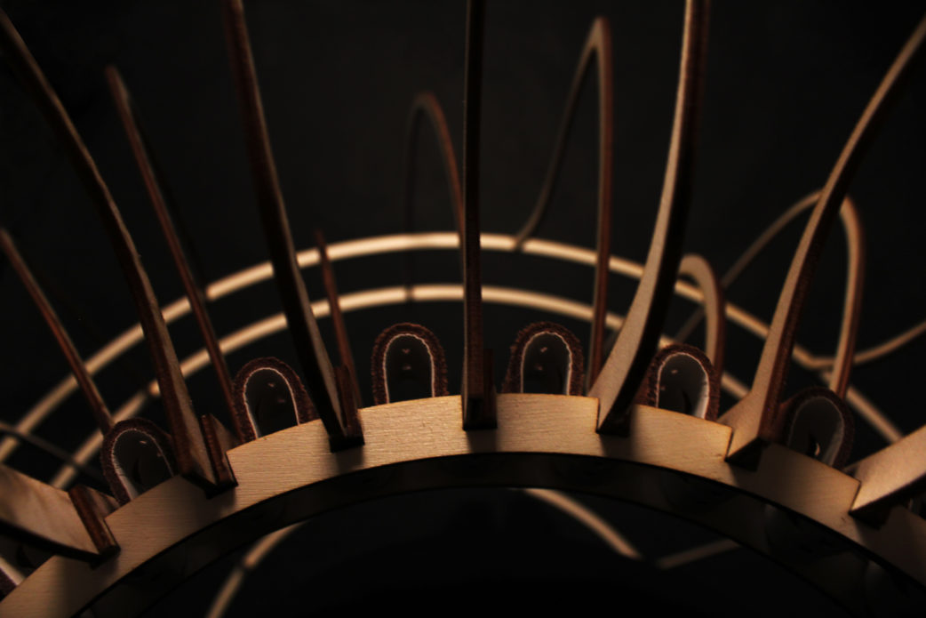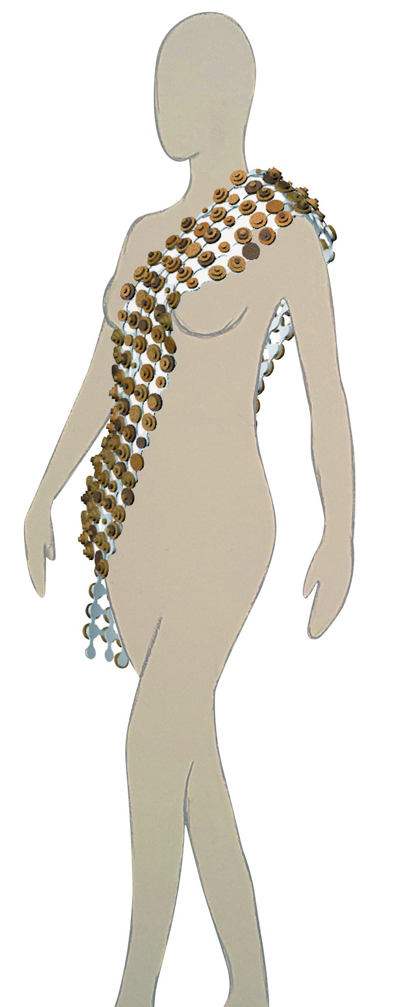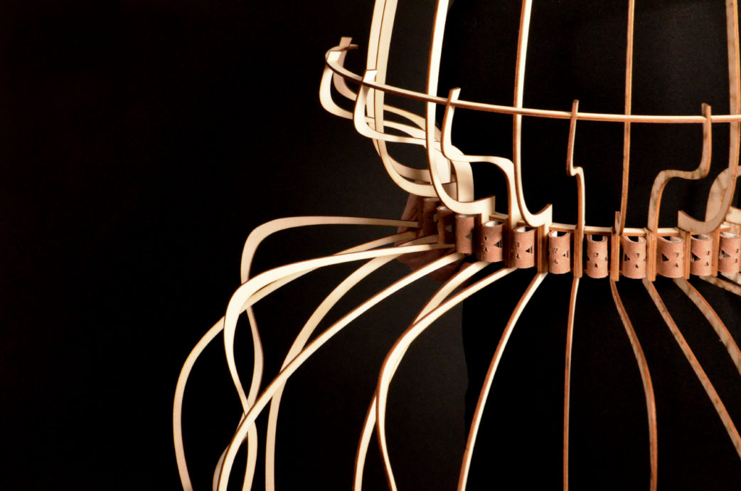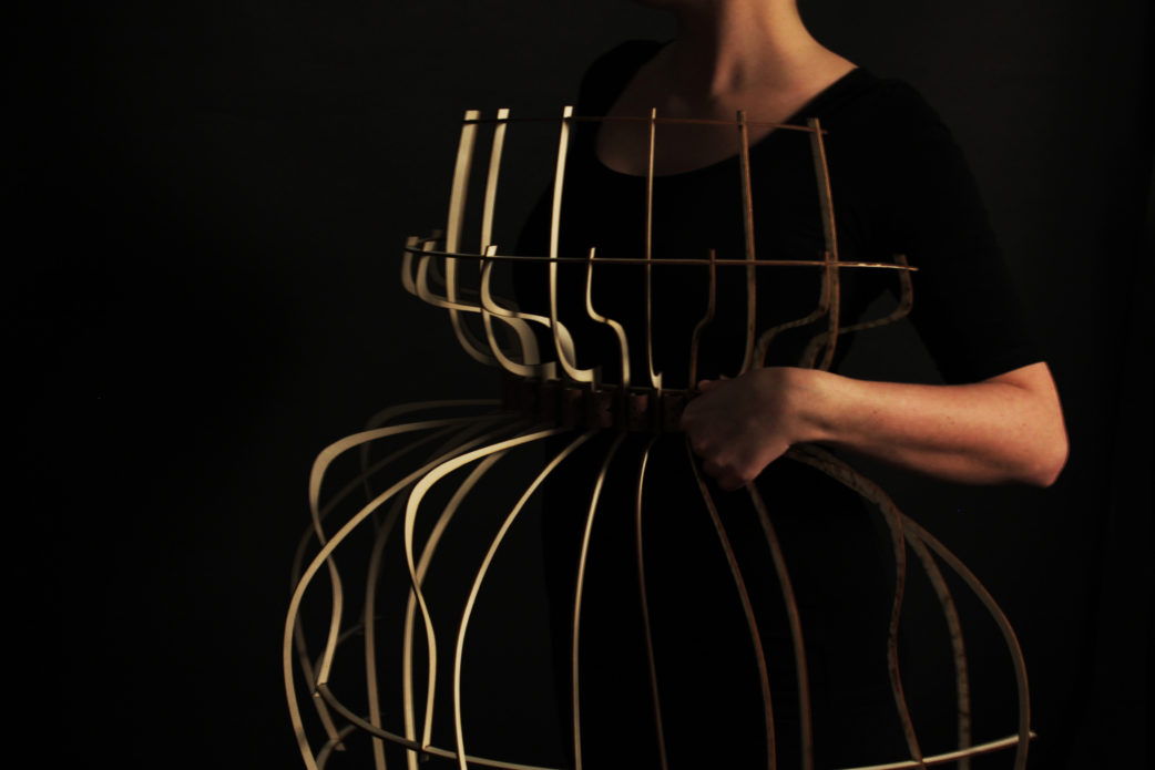 Textile materials create a flexible structure, which can be adapted to the shape of the body with the help of a wire. At the front, the woven structure is held together by circular elements made of different types of wood, which can be individually assembled and sticked together. The back shows the construction of the design. The origin idea originates from the characteristics of baroque dresses, which are multi-layered and emphasize certain body regions.