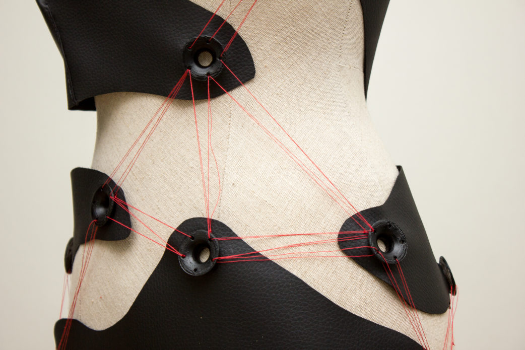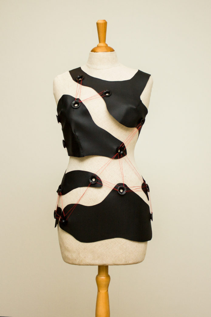 This ‘Generative Skin’ is a garment which is to be worn on the upper body. It consists of three individual elements, which are connected to one another via connector elements as well as red threads in defined locations. The asymmetrical design creates tension and a certain optical stimulus through the free surfaces. This principle creates a comfortable wearing comfort, since the individual elements can be connected to one another in a variable manner depending on the size and shape. The material is made of leather, as it can conform to the body like a second skin, but it has the necessary strength and stability to be a proper piece of clothing.