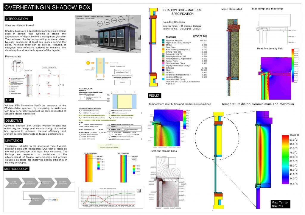 Shadow boxes are specialized construction elements used in curtain wall systems, creating the appearance of depth behind transparent glass panes. The additional incorporation of metal sheets can enhance the visual depth and aesthetic appeal. However a common problem that arises with this design is overheating.