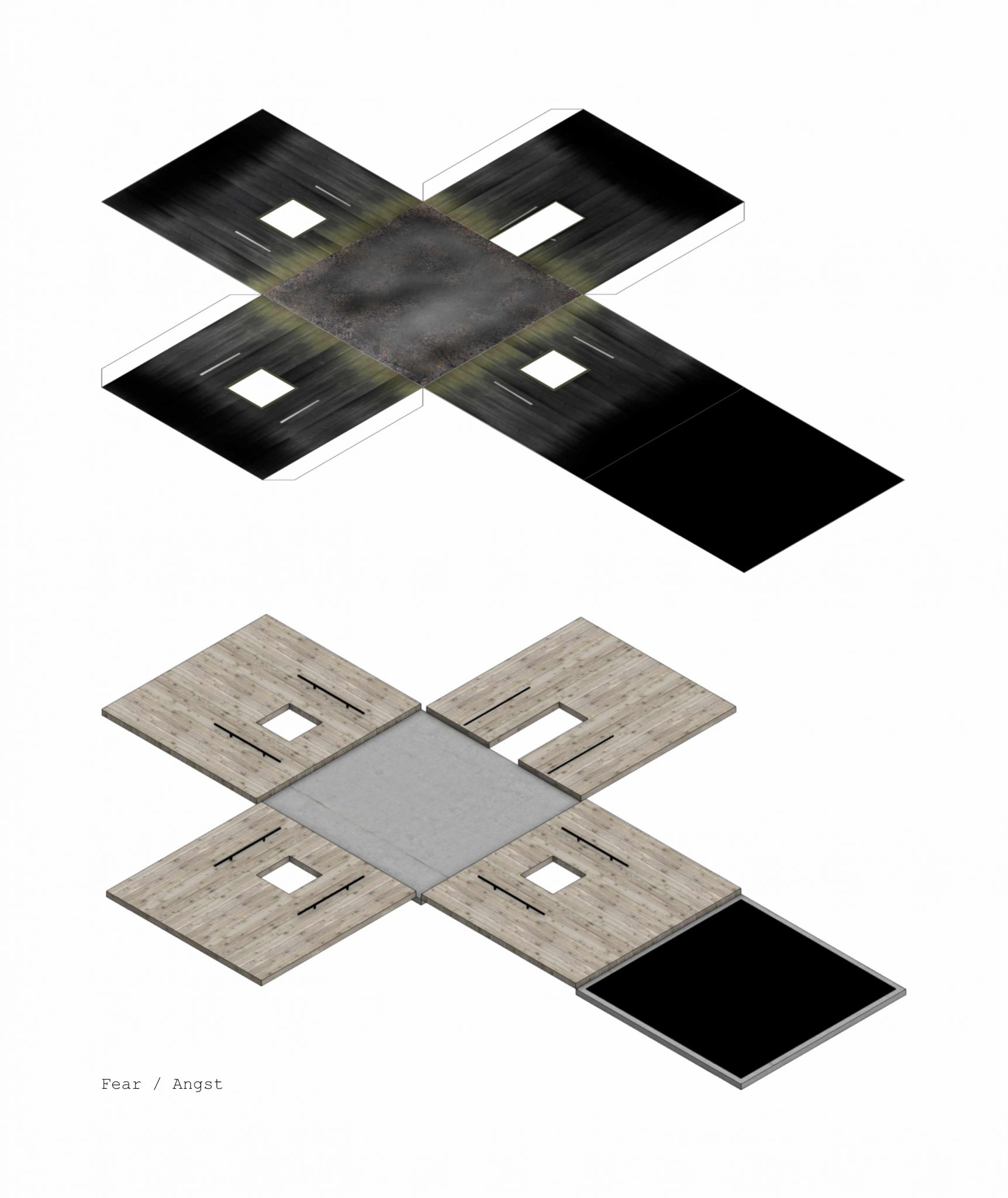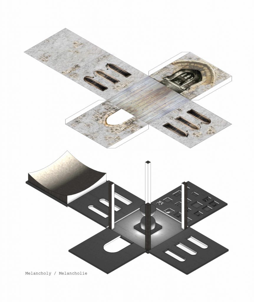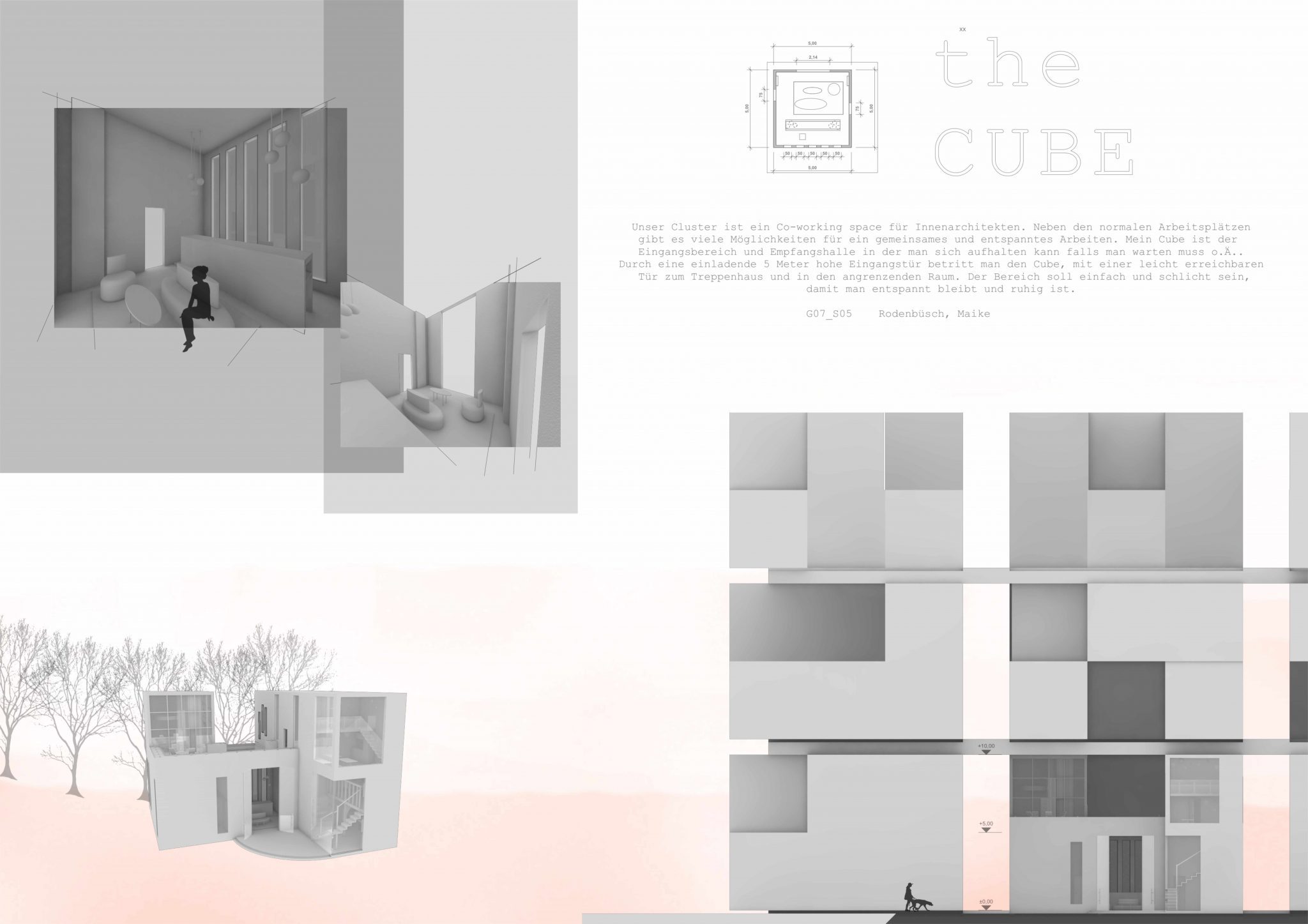 With the aid of Gimp, Adobe Photoshop or Affinity Photo, the students create a visual collage of a fictional architectural concept. They develop the interior view of a small cube based on a certain emotion using both self-taken and researched photographs.
