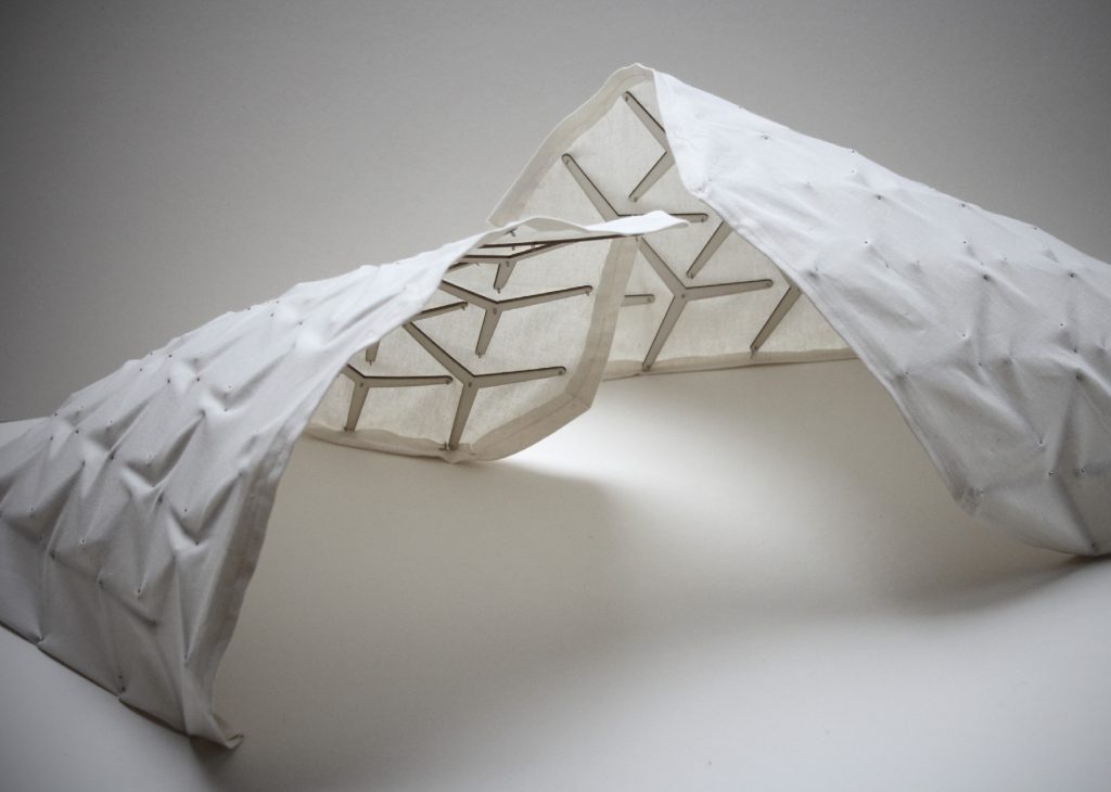 The interaction of many triangular shapes created by fold lines gives a construction load-bearing capacity, even if it is a light material such as cardboard. In addition, it can be done Folds up to save space and is lightweight in the application. We found it almost fascinating the use of an everyday material such as Cardboard. The individual cardboard triangles are Wrapped in foil to make it weatherproof make. These are then sewn together with a nylon cord so that they become your actual folding structure. Through the Gaps in the arrangement mean that even thicker cardboard can be folded into the desired shape.